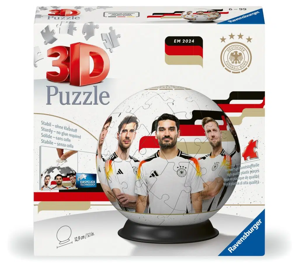 Nachdem Adidas Ende März 2024 gemeinsam mit dem DFB die neuen Trikots für die Heim-Europameisterschaft 2024 enthüllt hat, erscheinen im April die ersten Fanprodukte von Ravensburger mit den Stars der aktuellen deutschen Nationalmannschaft. Gute Vorbereitung ist alles: Mit jedem gelegten Puzzleteil steigt die Vorfreude auf die diesjährige Europameisterschaft im heimischen Wohnzimmer. Jedes gelegte Puzzleteil – ob vom 300 Teile Puzzle oder vom 3D Puzzleball – wird zum ganz persönlichen Heimspiel. Da kann die EM kommen!
