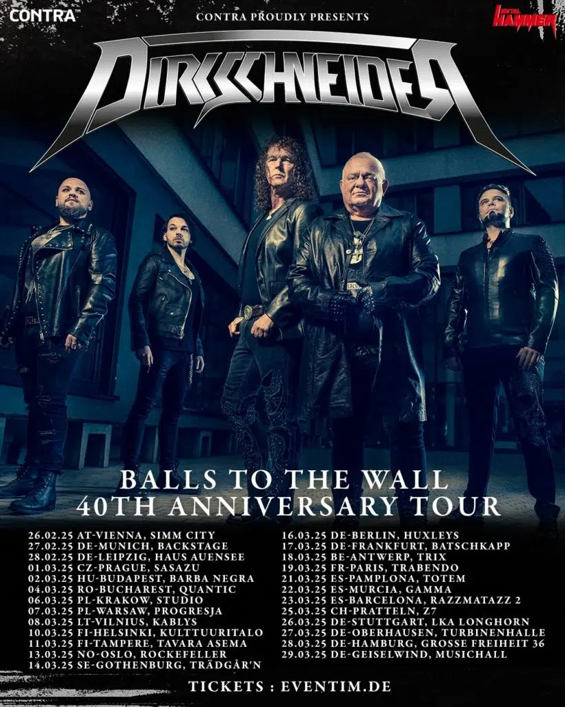 Das Motto „Balls To The Wall“ [dt. so viel wie „mit aller Kraft“] trifft definitiv auch auf die aktuelle DIRKSCHNEIDER-Besetzung, der zudem das trommelnde Uhrwerk Sven Dirkschneider sowie die begnadeten Gitarristen Andrey Smirnov und Fabian „Dee“ Dammers angehören, zu. Umso passender, dass kürzlich das 40-jährige Jubiläum des ursprünglich Ende 1983 veröffentlichten und zudem meistverkauften und bekanntesten ACCEPT-Studioalbums mitten in die vorherrschende Hochphase der Truppe fiel. So möchte die Band es sich natürlich nicht nehmen lassen, die gesamte Platte live zum Besten zu geben, um deren Ehrentag nachträglich zu feiern – und das alles AUF TOURLÄNGE im Frühjahr 2025!