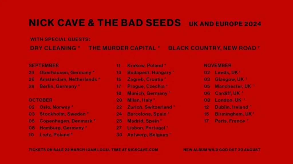 Nick Cave & The Bad Seeds recently announced their first headline tour of the UK and Europe since 2017, across 17 countries this Autumn, starting on September 24th in Germany with UK shows from November 2nd. Due to huge demand for tickets, the band have since added second shows in Berlin, Amsterdam, Antwerp, Copenhagen, Dublin and London. Nick Cave & The Bad Seeds are widely regarded as one of the greatest live acts in the world today, and these shows are some of the most hotly anticipated of 2024.