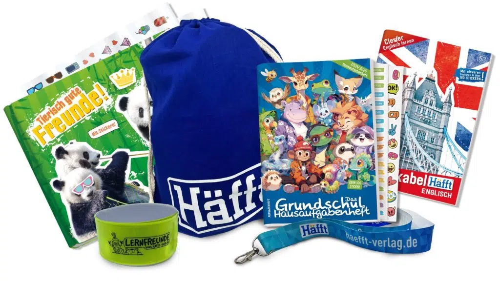 Der Häfft-Verlag verlost Grundschulpakete mit allerhand nützlichen Produkten aus dem Häfft-Sortiment. Neben dem beliebten Hausaufgabenheft sind im Verlosungs-Paket das Vokabelheft mit cleveren Features und Stickern enthalten, ein Erinnerungsalbum für Freunde und Schulkameraden, Reflektoren für den sicheren Schulweg sowie Turnbeutel und Schlüsselanhänger.