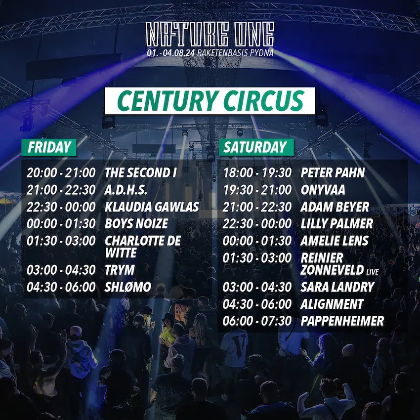 Im Century Circus darf man sich auf Female Empowerment von Lilly Palmer um 22:30 Uhr, Amelie Lens von 00:00 bis 01:30 Uhr und Sara Landry von 03:00 bis 04:30 Uhr freuen. Zwischendurch spielt der Niederländer Reinier Zonneveld sein Liveset (01:30 – 03:00 Uhr). Alignment übernimmt (04:30 – 06:00 Uhr) und Pappenheimer (06:00 – 07:30 Uhr) liefern und das Finale des zweiten Tages im Century Circus.