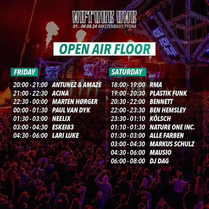 Am Samstag sind die Auftritte des dänischen DJ und Producers Kölsch ab 23:30 Uhr und im Anschluss der deutsche Produzent Alle Farben ein Must-See. Mausio spielt von 04:30 bis 06:00 Uhr das Closing-Set der NATURE ONE 2024 auf dem Hauptfloor.