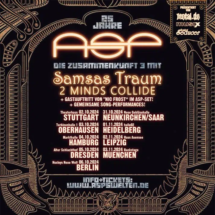 Seit 25 Jahren machen ASP ihr Ding – authentisch und stets sich selbst und ihren Fans treu –, und dies gilt es im Jahre 2024 im Rahmen einer besonderen Jubiläumstour zu feiern. Natürlich nicht ohne exquisite Begleitung: Samsas Traum und Two Minds Collide sind nicht nur Special Guests, sondern zudem Teil gemeinsamer Auftritte im Rahmen des Mini-Festival-Konzeptes. Außerdem wurde Nic Frost (Ex-Spielbann) als Duett-Partnerin im ASP-Set angekündigt. Am 06.09. erscheint ausserdem das Jubiläums Doppelalbum „RETURNING TO HAUNTED PLACES“.