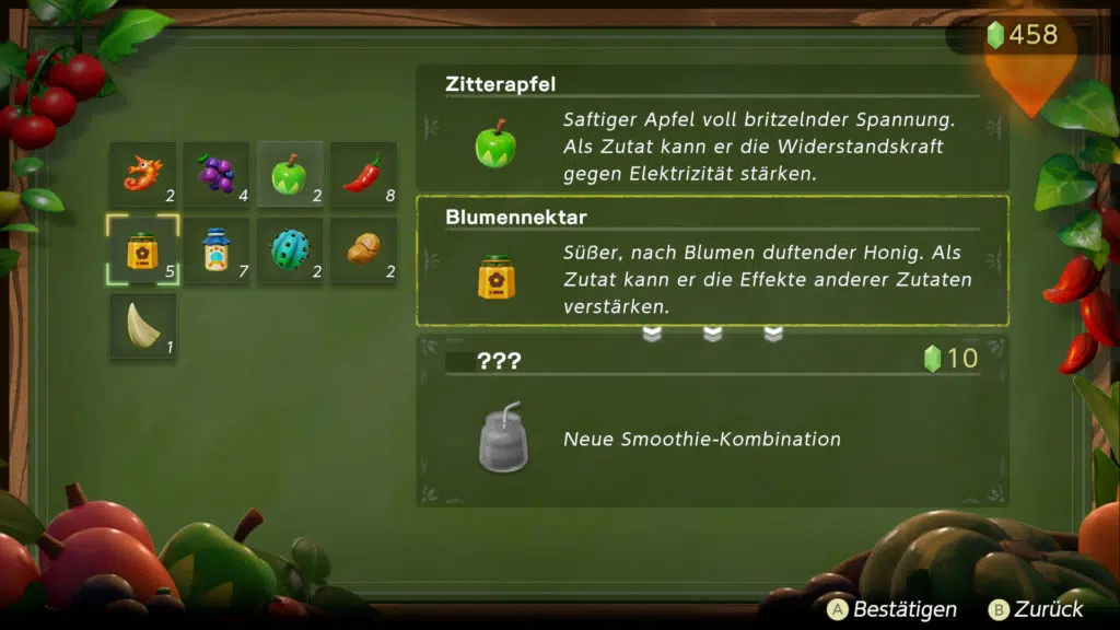 Überall in Hyrule stoßen Spieler:innen zudem auf Händler-Dekus, die Smoothie-Shops betreiben. Dort werden aus gesammelten Zutaten köstliche Drinks gemixt, die je nach Inhalt ganz unterschiedlich wirken, etwa indem sie die Gesundheit wiederherstellen. Obendrein kann sich Zelda mit verschiedenen Outfits und Accessoires ausstatten, dies vor allem, um bestimmte Fähigkeiten zu verbessern.
