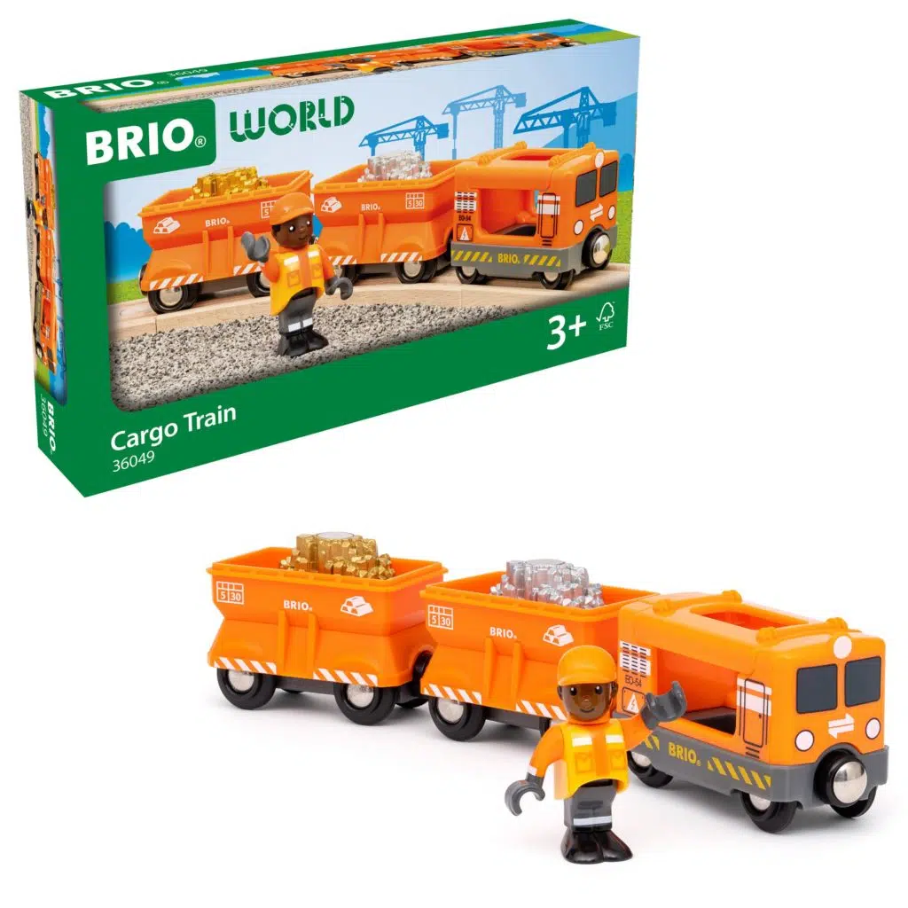 Der Güterzug, in strahlendem Orange, bringt nicht nur Farbe ins Kinderzimmer, sondern auch eine kostbare Ladung. Die Waggons sind prall gefüllt mit einem glänzendem „Goldbarren“ und schimmerndem Silber. Kleine Eisenbahn-Fans öffnen vorne das Dach und setzen den Lokführer auf den Fahrersitz. Der Güterzug ist eine limitiert und nur in 2024 erhältlich. Kompatibel mit den Schienen und Zügen aus der BRIO World.