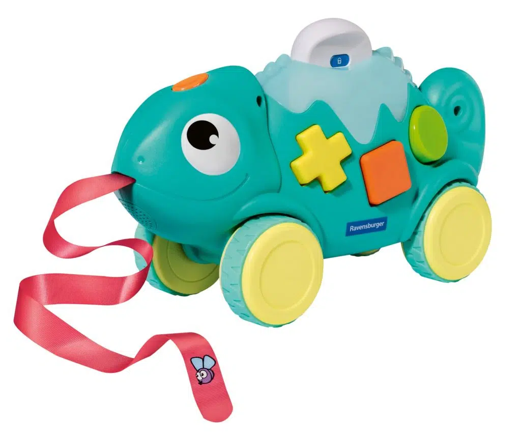 So wie ein Chamäleon faszinierenderweise seine Körperfarbe ändern kann, wechselt auch dieses Multifunktions-Spielzeug seine Farbe und führt damit durch drei Spielstufen. Sechs bunte Formen sowie spannende Licht- und Soundeffekte animieren Kinder ab einem Jahr zum Entdecken, Stecken und Spielen. Die drei Spielmodi, vom freien Spiel über das richtige Zuordnen von Formen und Farben bis hin zum Farb-Memo, fördern die Feinmotorik der Kinder und vermitteln ihnen spielerisch erste Regeln. Mit seiner langen Zunge eignet sich das Chamäleon auch als Nachziehtier, das die Kleinen mit Musik zum Krabbeln und Laufen lernen animiert. Was die Ohren der Eltern schont: Dank Stumm-Modus ist das Spielzeug auch leise spielbar, ohne auf Lichteffekte zu verzichten.