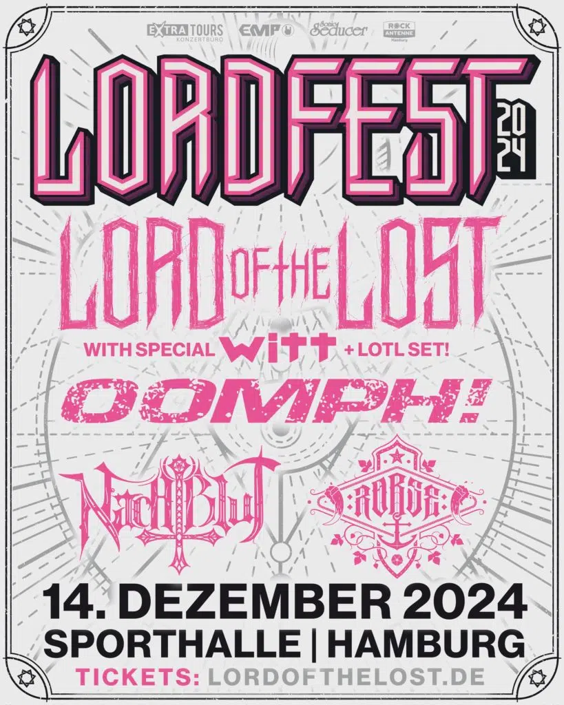 Das LORDFEST 2024 wird natürlich wieder mit den Gastgebern selbst und einem Special WITT + LOTL Set, OOMPH!, NACHTBLUT und ROBSE stattfinden. Für alle, die sich noch Karten sichern müssen, geht es hier zu den Tickets.
