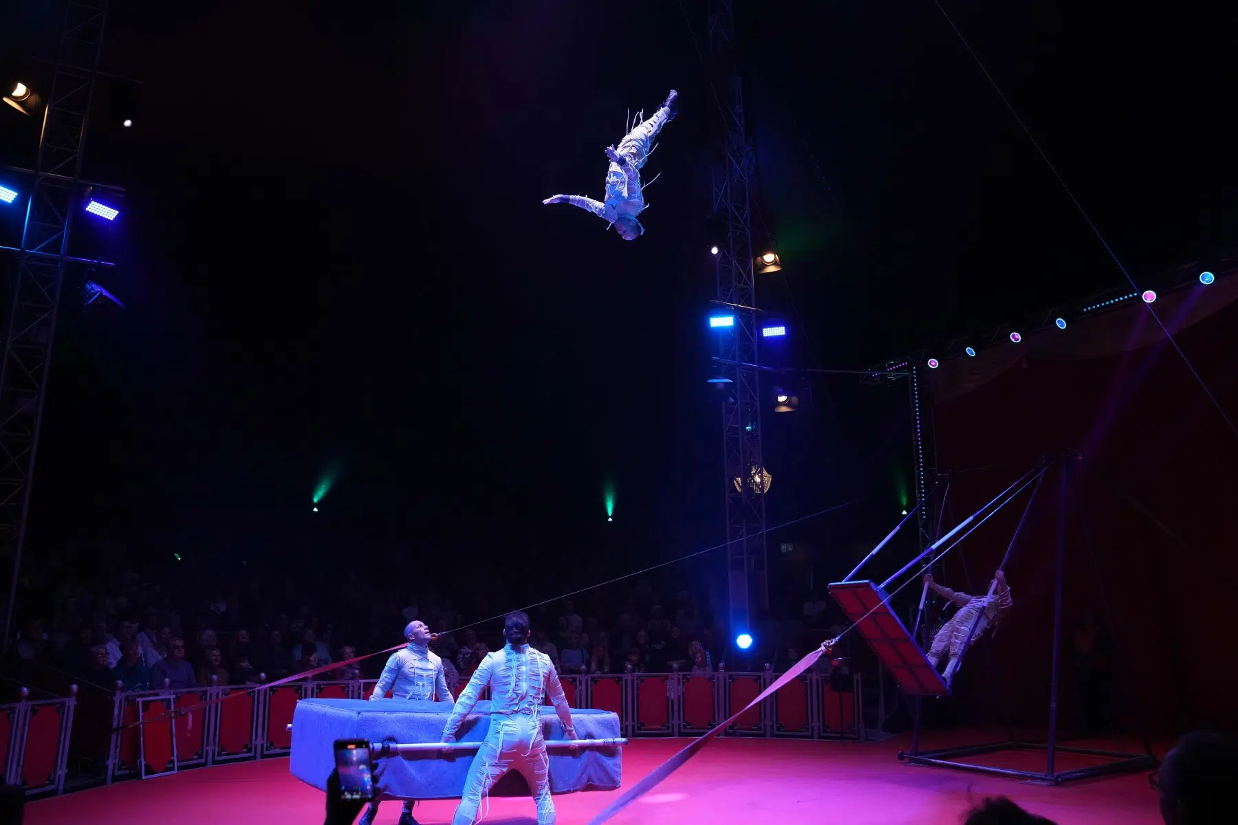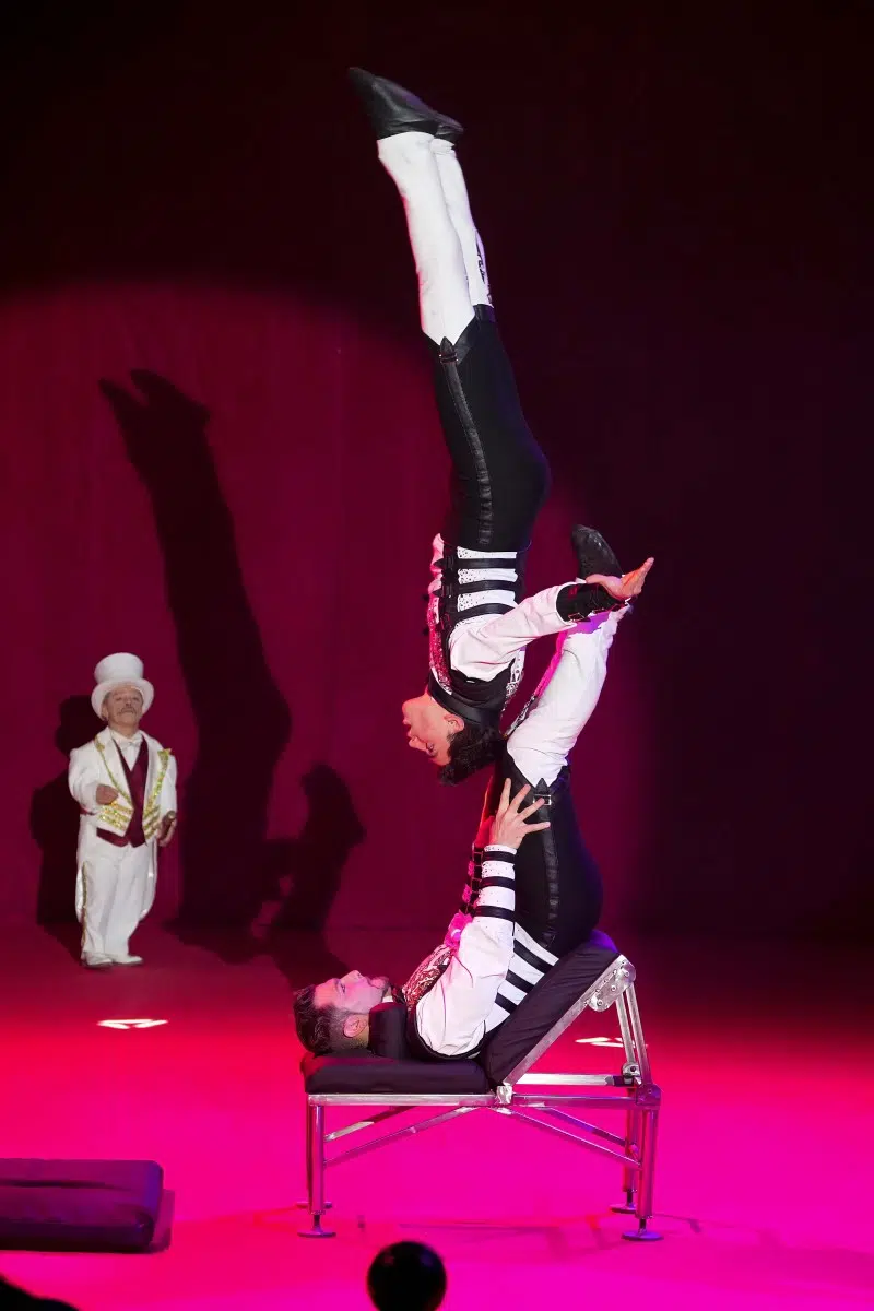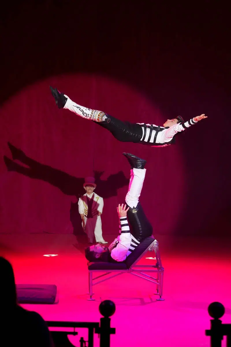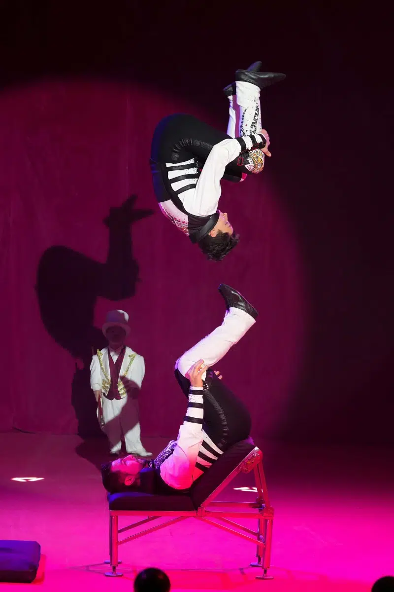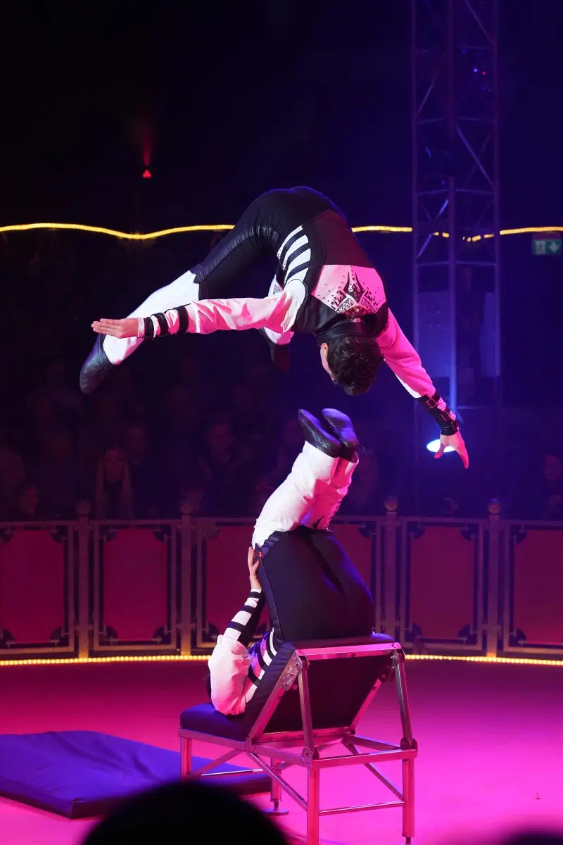 Die Demian Artistics Group beeindruckt mit ihrer Reck-Performance und setzt später mit der spektakulären Todesschaukel den dramatischen Höhepunkt des Abends. Ihre Perfektion und der Mut ihrer Darbietungen sorgen für tosenden Applaus.