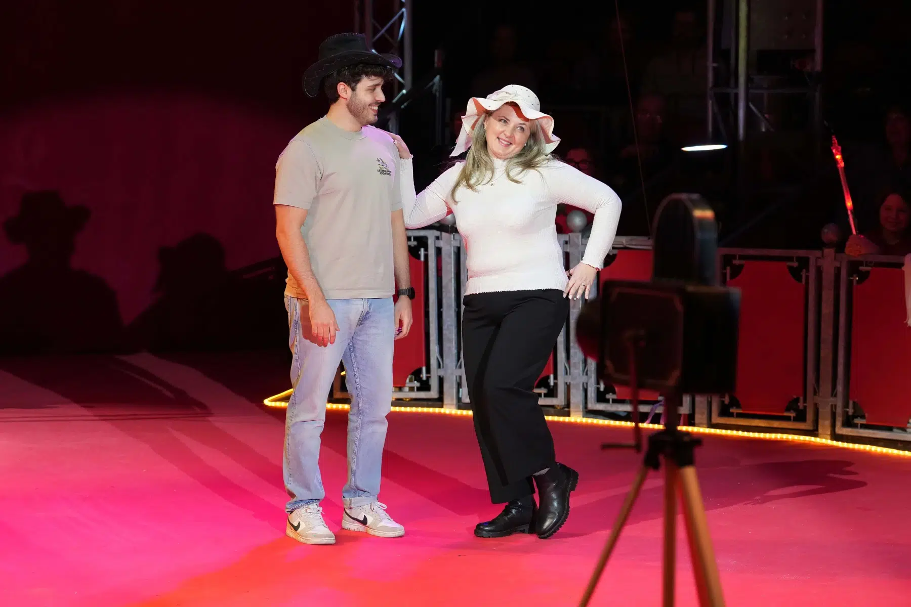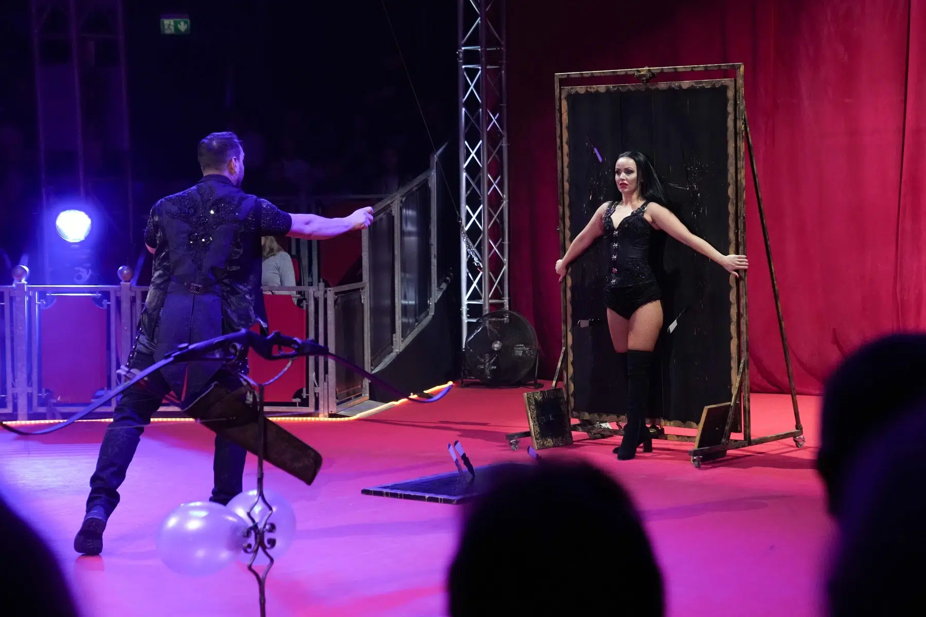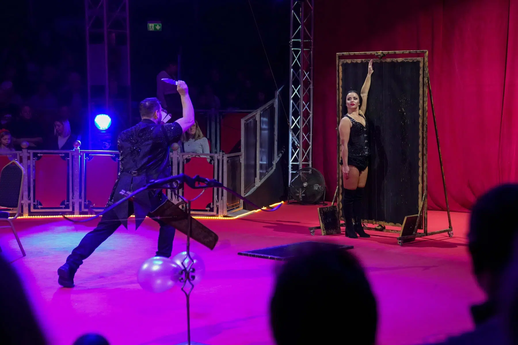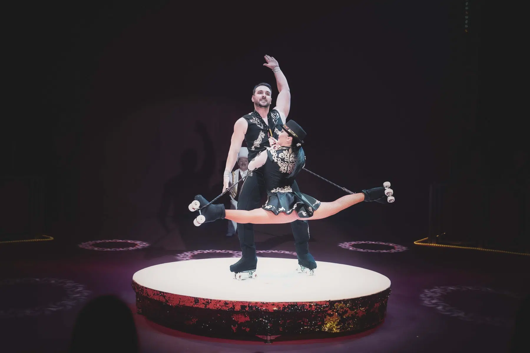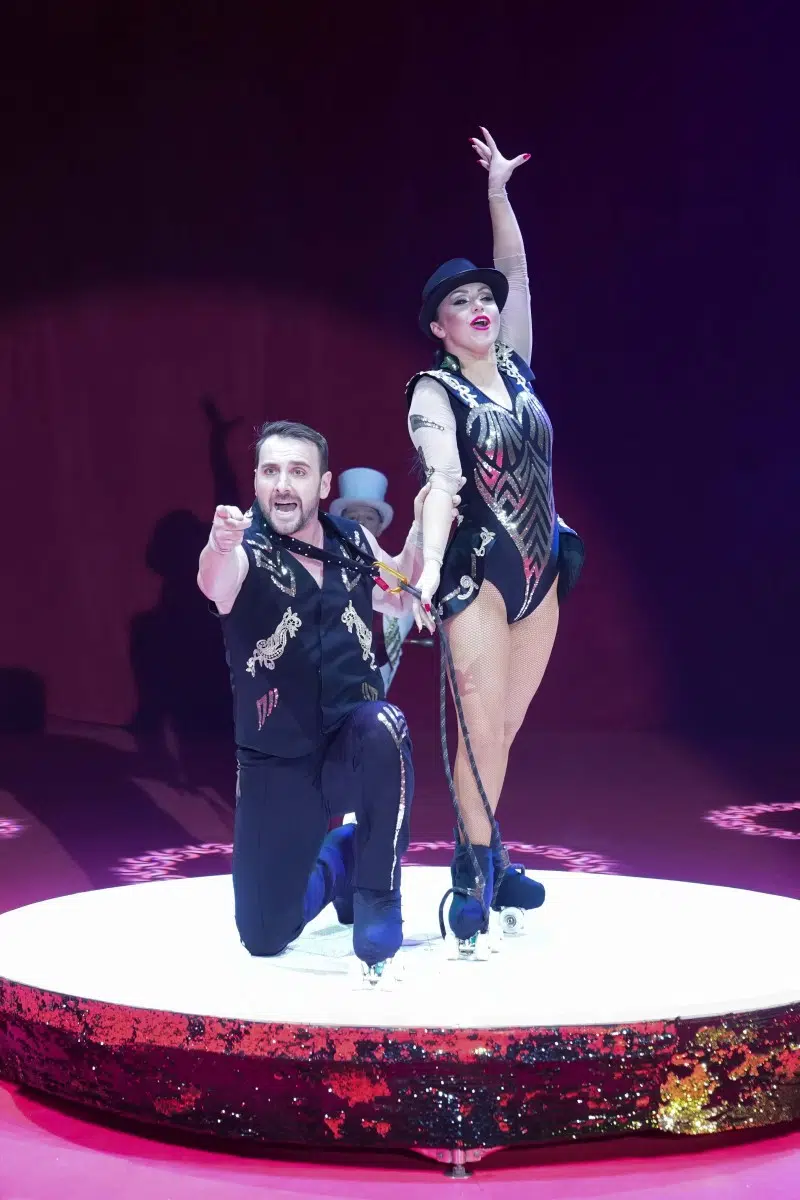 Das Duo Dinamic begeistert gleich mehrfach: Zuerst mit ihrer Präzision beim Messerwerfen und später mit einer rasanten Rollschuhnummer, bei der das Zelt vor Spannung bebte.