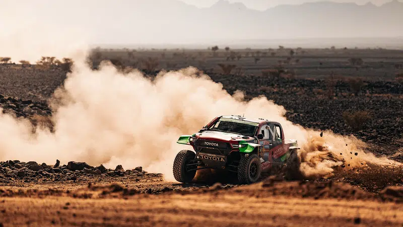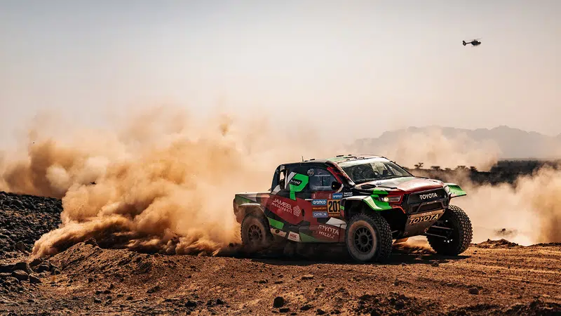 al-‚Ula, Saudi-Arabien (8. Januar 2025) – Auf das Material Acht geben: ja, klar. Dabei die Weltelite des Marathon-Rallyesports distanzieren: ja, bitte! Yazeed Al-Rajhi und Timo Gottschalk haben die vierte Etappe der Rallye Dakar gewonnen und damit Rang zwei im Gesamtklassement zurückerobert. Dabei gelang ihnen auf dem Weg von Al-Henakiyah nach al-‚Ula die Quadratur des Kreises, die auch bei der „Dakar“ nur rechnerisch lösbar ist. Dabei erwies sich das Kalkül der Zurückhaltung vom Vortag als goldrichtig: Das saudi-arabisch-brandenburgische Duo profitierte von seinem späten Start als 18. Team und von den am Vortag gesammelten Erfahrungen im vulkanischen und steinigen Gelände. Von Beginn der 415-Kilometer-Sonderprüfung an setzten sie sich an die Spitze der Zeitentabelle und nahmen den Gesamtführenden Henk Lategan/Brett Cummings (RSA/RSA) trotz dreier Reifenschäden immer mehr Zeit ab. 6:54 Minuten Rückstand in der Gesamtwertung sind davon noch übrig. Lategan/Cummings starten wie Al-Rajhi/Gottschalk mit einem Toyota Hilux. Neue Gesamtdritte sind Mattias Ekström/Emil Bergkvist (SWE/SWE, Ford) – ihr Abstand auf Al-Rajhi/Gottschalk beträgt nach Teil eins der Marathonetappe rund 15 Minuten.