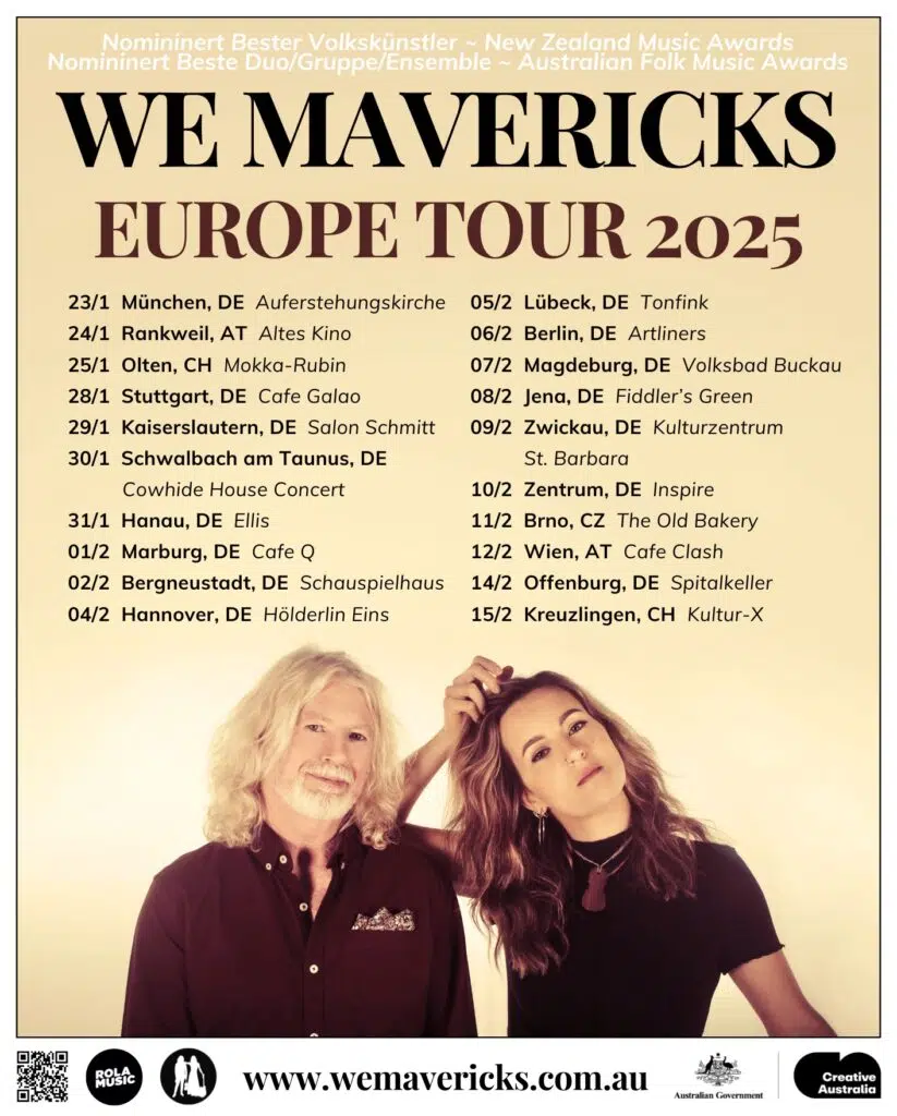 We Mavericks sind Lindsay Martin (AU) und Victoria Vigenser (NZ) und strahlen eine aussergewöhnliche Anziehungskraft aus, die sie bereits auf zahllose Festivalbühnen in Australien und Neuseeland gebracht hat. Bei den Australian Folk Music Awards wurden sie als „Best Folk Artist“ und „Artist of the Year“ nominiert und von der Folk Alliance International als Showcase-Künstler ausgewählt.