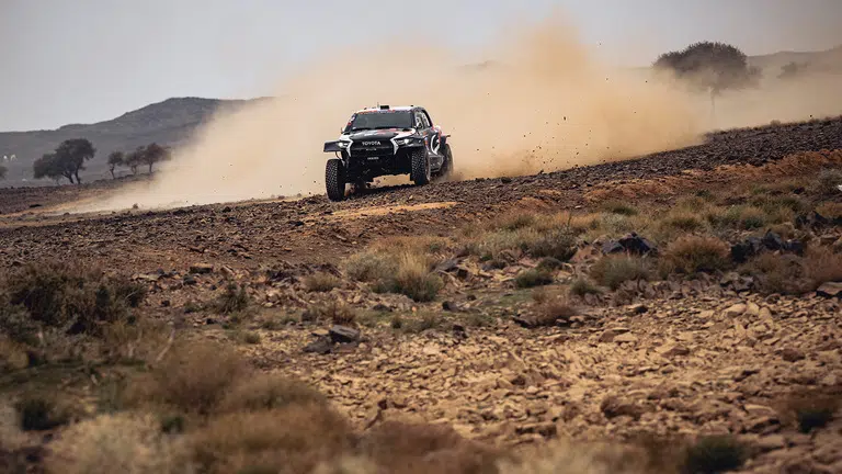 Ha’il, Saudi-Arabien (9. Januar 2025) – Reifenschäden gehören zur „Dakar“-Tagesordnung. Blöd nur, wenn es mehr sind, als Ersatzreifen an Bord sind. Giniel de Villiers und Dirk von Zitzewitz haben auf der fünften Etappe der Rallye Dakar erneut Zeit eingebüßt. Nachdem sie mit reifenschonender Fahrweise am Vortag ihrem Prinzip der steten Konstanz treu geblieben waren, forderte der enorm harte zweite Teil der Marathon-Etappe auch bei ihnen Tribut. Nachdem ihre Ersatzräder aufgebraucht waren, musste das südafrikanisch-norddeutsche Duo auf eine Spende warten. „GdV“ und „DvZ“ erhielten sie nach rund 20 Minuten Wartezeit von ihren Toyota-Teamkollegen Guy David Botterill/Dennis Murphy (RSA/RSA). So konnten sie ihre Fahrt vorsichtig fortsetzen. Insgesamt schlug der Zeitverlust mit rund 60 Minuten zu Buche.