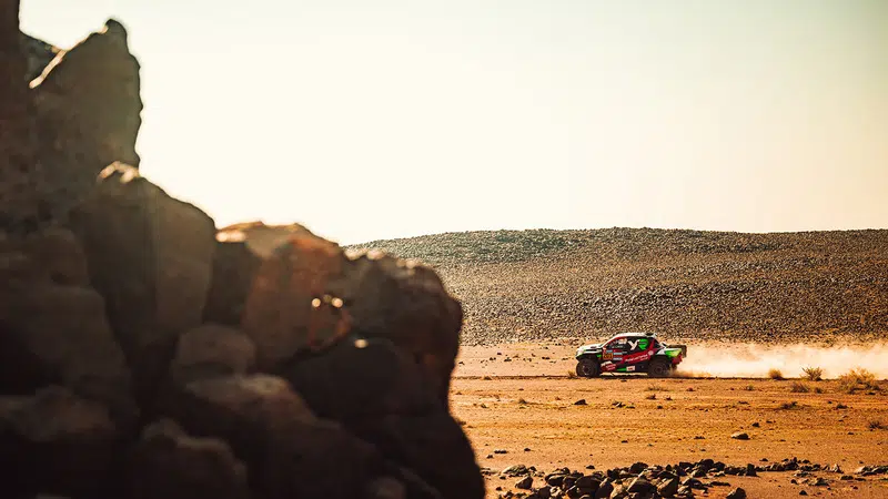 „Eine Prüfung mit besonders vielen Steinen, richtig große, richtig scharfe. Wir haben uns einen Reifenschaden eingefangen. Es gab aber auch Dünen, die wirklich schön zu fahren waren. Alles in allem eine anstrengende Etappe!“ YAZEED AL-RAHJI