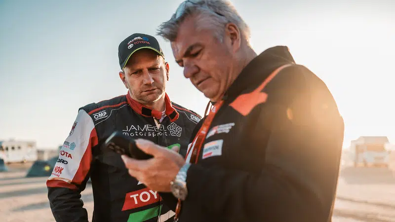 Dawadimi, Saudi-Arabien (12. Januar 2025) – Yazeed Al-Rajhi und Timo Gottschalk greifen nach der Gesamtführung der Rallye Dakar 2025. Nach Abschluss der siebten Etappe liegen sie nur noch 21 Sekunden hinter den Spitzenreitern Henk Lategan und Brett Cummings (RSA/RSA), die wie Al-Rajhi/Gottschalk einen Toyota Hilux steuern. Im Marathon-Rallyesport eine Winzigkeit. Zur Veranschaulichung: Das entspricht nach 3.603 absolvierten Prüfungskilometern lediglich 564 Metern und 70 Zentimetern. Ein kurioser Etappenverlauf hielt dabei Fahrer, Beifahrer und Beobachter in Atem. Eine falsch ausgewiesene Wegbeschreibung im Roadbook sorgte bereits früh dafür, dass sich alle Topteams verfuhren und mehrere Canyons im Lottoverfahren ausprobieren mussten – Chaos im Staub inklusive. Die Rallyeleitung strich dieses Segment jedoch nachträglich aus der Wertung. Zu den großen Profiteuren zählten dabei alle Verfolger im Gesamtklassement.