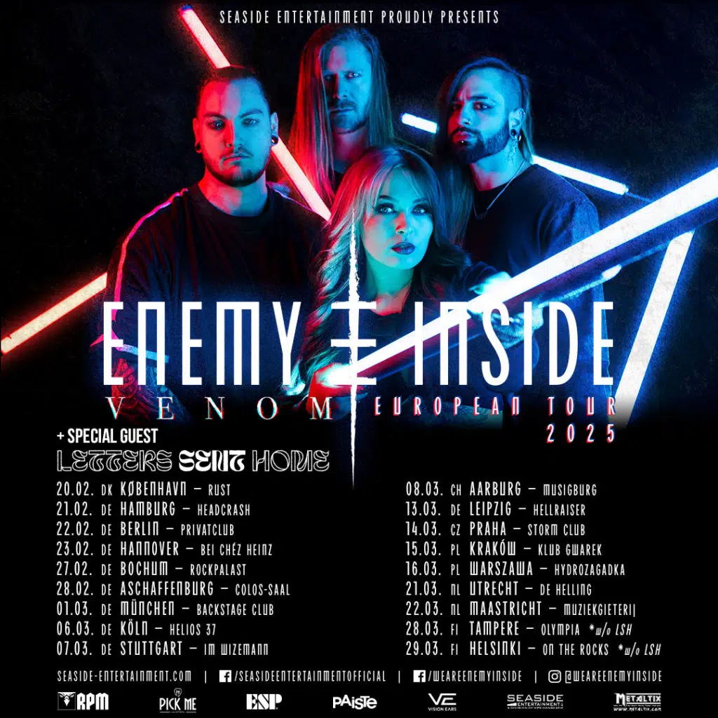 ENEMY INSIDEs begleitende Headlinetour (Support: LETTERS SENT HOME) wird sie im Frühjahr durch 18 Städte in sieben Ländern führen, gefolgt von Auftritten beim Full Metal Mayrhofen, dem Metal Frenzy Open Air, dem John Smith Rock Festival sowie ihrer Rückkehr zum Wacken Open Air (!); weitere Termine befinden sich in Vorbereitung. Sichert euch hier Tickets: http://enemy-inside.com/#tourdates