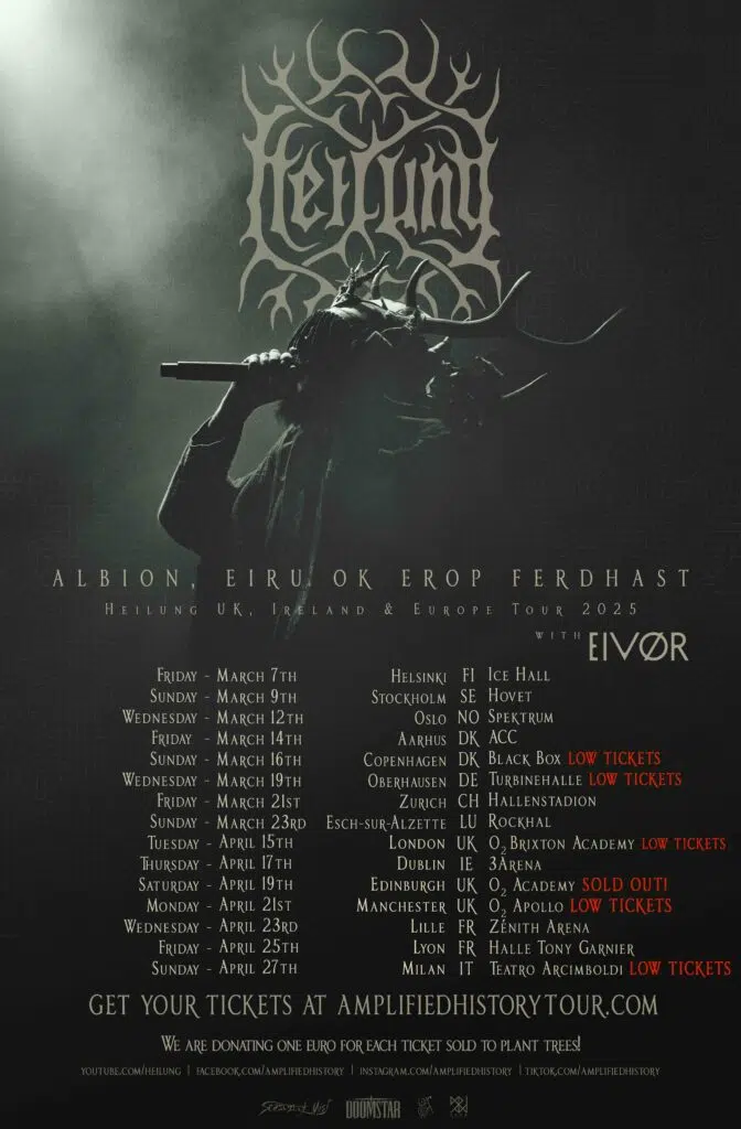 Im März begeben sich Heilung auf eine ihrer letzten Pilgerreisen durch die heiligen Lande Albion, Eiru und Erop, bevor sie sich auf unbestimmte Zeit von der Bühne verabschieden. Begleitet von der faröischen Musikerin Eivør wird das Kollektiv insgesamt 15 Konzerte in Großbritannien, Irland und auf dem europäischen Festland spielen.