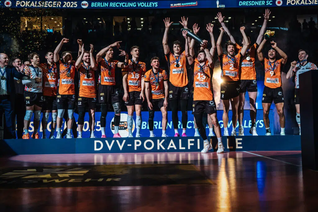 Die BERLIN RECYCLING Volleys sind DVV-Pokalsieger 2025. In einem umkämpften Spiel vor 10.267 Fans setzten sie sich knapp 3:2 (25:23, 22:25, 25:27, 25:19, 15:5) gegen die SWD powervolleys Düren durch. Mit dem insgesamt achten Pokaltriumph gelang dem Team von Trainer Joel Banks der Titel-Hattrick.