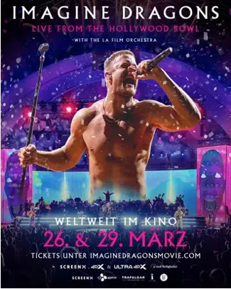 IMAGINE DRAGONS: LIVE FROM THE HOLLYWOOD BOWL (WITH THE LA FILM ORCHESTERA) ist am 26. März und 29. März in den Kinos zu sehen, Tickets gibt es ab 12. Februar um 15:00 Uhr auf ImagineDragonsMovie.com.
