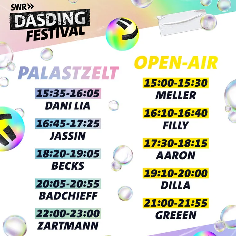 Die ersten beiden DASDING Festivals (mit Nina Chuba, Provinz, Paula Hartmann, uva.) waren auch ausverkauft, beim dritten hat’s nicht ganz gereicht und nun hoffen wir wieder auf volles Haus. Bzw. Palastzelt! Dort steht die Hauptbühne des Festivals und draussen gibt es noch eine große Open Air Bühne. Neu bestätigt sind nun noch AARON, DANI LIA, FILLY und MELLER. Das Line Up ist komplett und wir freuen uns über Berichterstattungen und stehen auch schon für Akkreditierungen zur Verfügung.