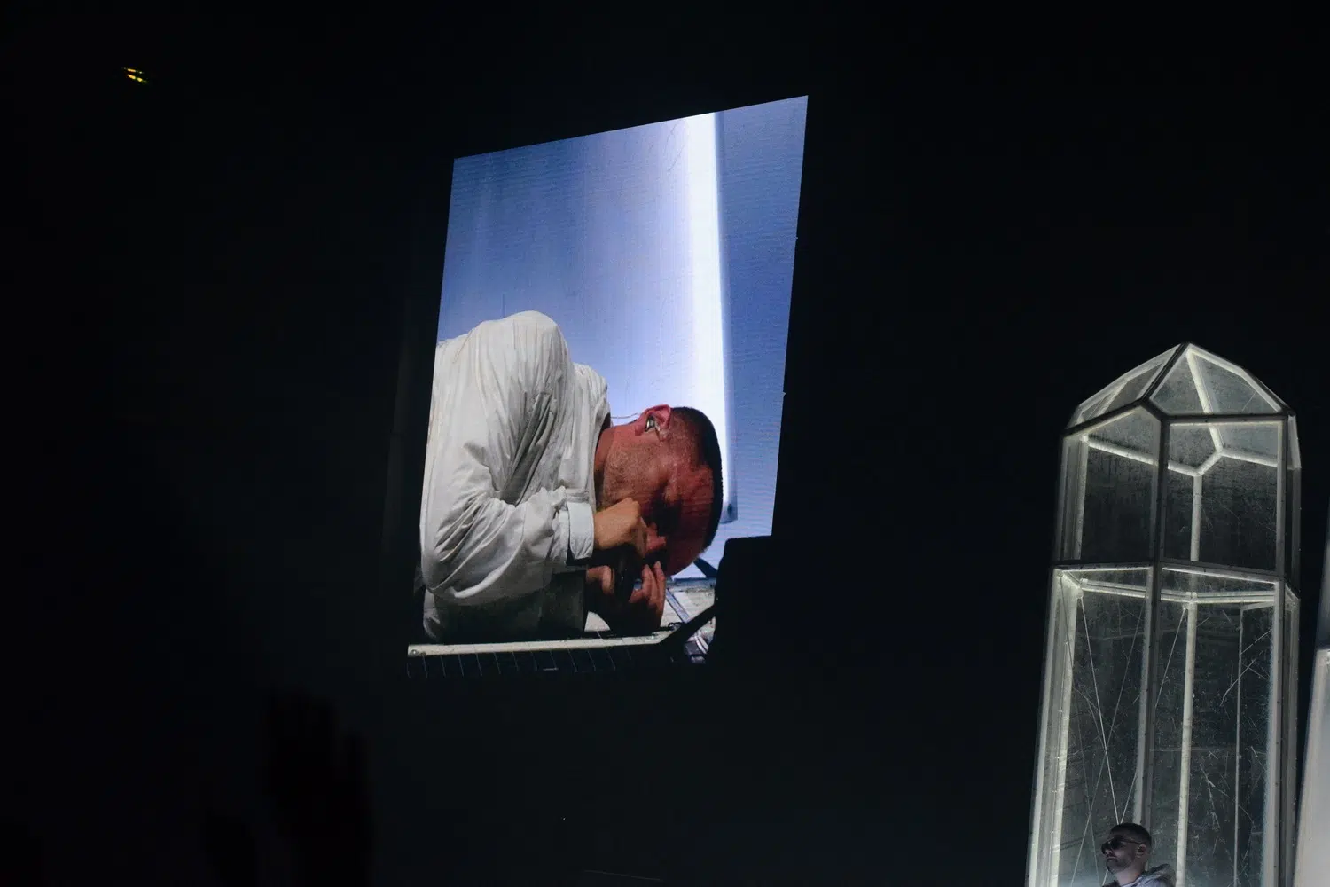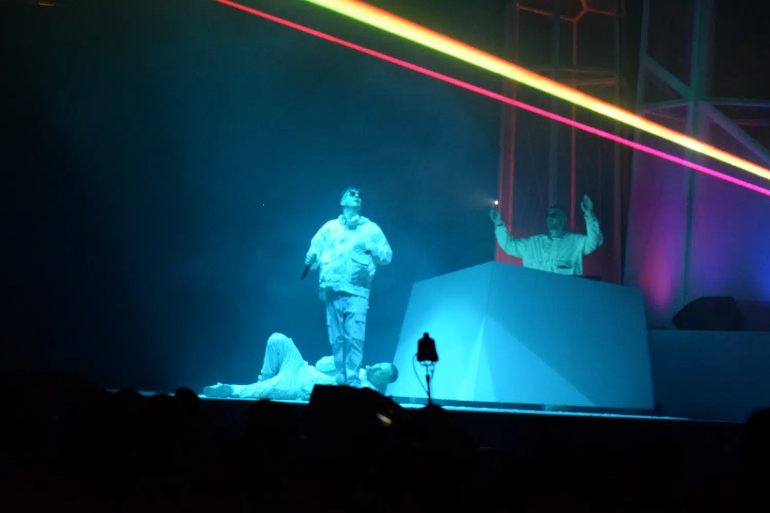 Während des Umbaus wurde der Vorhang, der die Bühne verdeckte, heruntergezogen, und das Publikum konnte das atemberaubende Bühnenbild bestaunen. Die Kristallformationen reflektierten die Laserstrahlen, und als die Nebelmaschinen Rauch ausstießen, hatte man das Gefühl, als würde der Nebel in die Kristalle aufsteigen. Die Band betrat die Bühne in weißen Anzügen, was die Lichteffekte noch verstärkte.