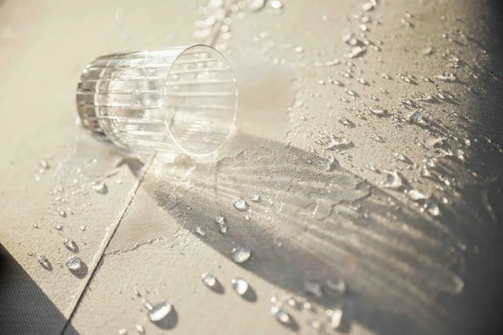 Sunbrella-Stoffe bestehen aus spinndüsengefärbtem Polyacrylgarn. Die Farbpigmente werden bereits während der Garnherstellung in die Faser integriert – nicht erst nachträglich aufgetragen. Das Ergebnis: langanhaltende Farbbrillanz, auch nach Jahren noch. Doch Farbechtheit ist nur ein Vorteil von vielen. Die Stoffe sind UV-beständig und bleichen auch bei intensiver Sonneneinstrahlung nicht aus. Flüssigkeiten perlen ab, Flecken lassen sich einfach entfernen. Durch die atmungsaktive Struktur entsteht keine Staunässe, das Risiko von Schimmel oder Stockflecken bleibt gering. Auch bei starker Nutzung und häufiger Reinigung bleibt das Material formstabil und reißfest. Die Reinigung ist unkompliziert: Meist genügt Wasser und milde Seife.