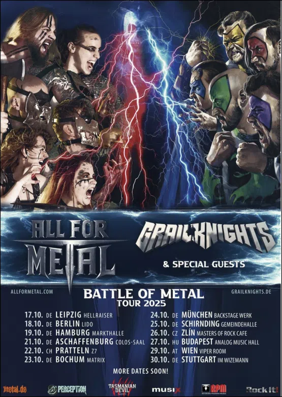 Das Quintett fügt hinzu: „GRAILKNIGHTS gemeinsam mit ALL FOR METAL auf Tour! Capes, Bizeps und Doublebass – so kann eine Tour nur episch werden! Im Herbst werden wir die Bühnen Europas beim „Battle Of Metal“ erobern – stellt euch dem Muskelmessen mit dem stinkenden Skull! Dieses Mal haben wir etwas ganz Besonderes im Gepäck, das selbst den Gral zum Erzittern bringen wird. Wir können es kaum erwarten, euch dieses neue Kapitel des Kampfes um den heil’gen Gral zu präsentieren!“