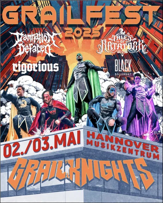 Die ersten GRAILKNIGHTS-Schlachten 2025 werden in Kürze in ihrer Hannoverschen Heimat geschlagen werden, wo sich Band und Battlechoir am 02. und 03. Mai einmal mehr unter dem „GRAILFEST“-Banner versammeln werden. An jedem der beiden geschichtsträchtigen Abende werden sich dem muskelbepackten Fünfer zwei weitere Truppen kühnster Musiker anschließen (02. Mai: DAMNATION DEFACED und RIGORIOUS; 03. Mai: TALES OF RATATÖSK und BLACK BASEMENT).