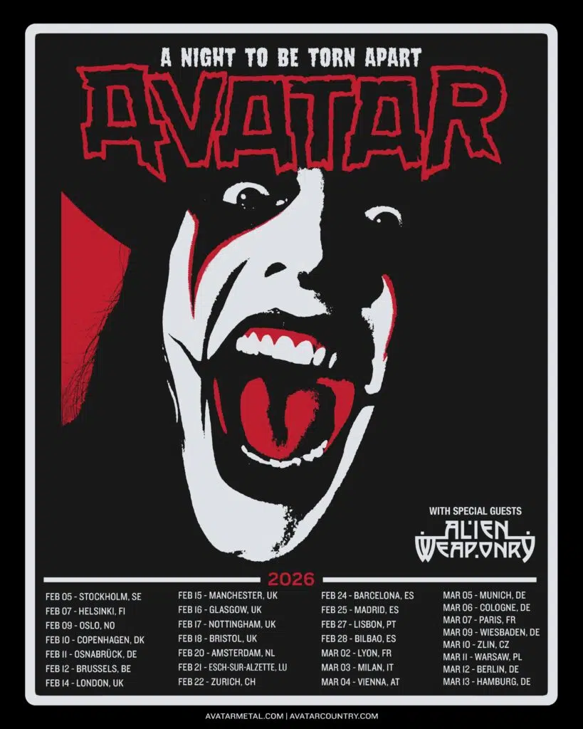 Damit geben sie einen ersten Vorgeschmack auf eine atemberaubende neue Live-Produktion ihrer bevorstehenden Welttournee, bei der Johannes Eckerström seine musische Truppe bestehend aus John Alfredsson, Jonas Jarlsby, Henrik Sandelin und Tim Öhrström um den Globus führen wird. Mit alten und neuen Songs aus der gesamten Band-Historie werden AVATAR so auftreten, wie man sie noch nie zuvor gesehen hat. Sie spielen einige der größten Shows ihrer 25-jährigen Karriere – darunter eine bahnbrechende Show in der Valentinsnacht im Londoner Exhibition – einem Veranstaltungsort in einem denkmalgeschützten Gebäude in White City.