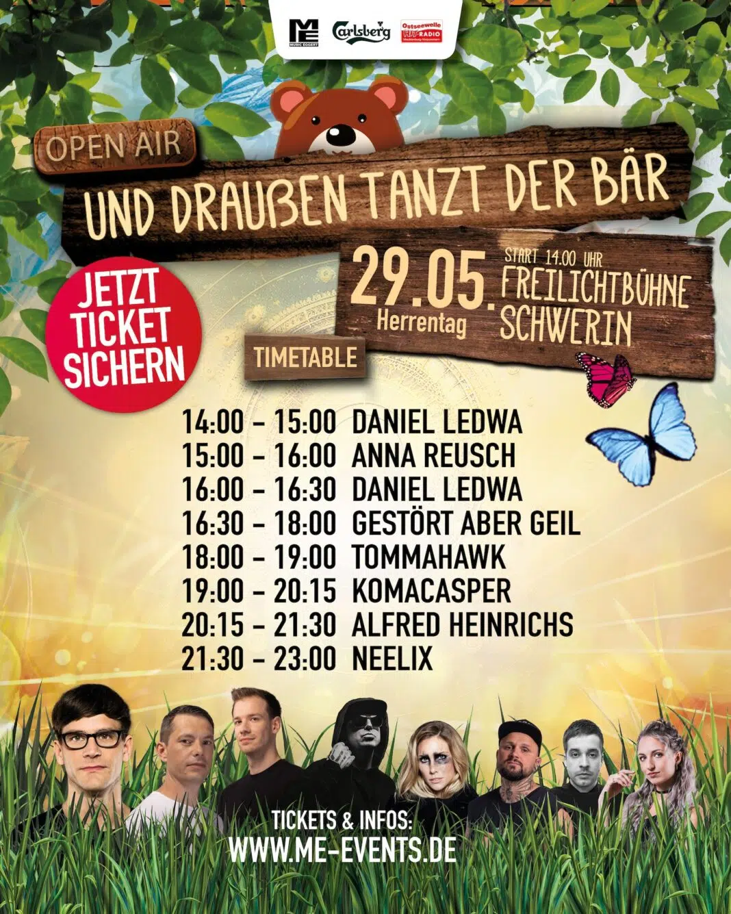 Am 29. Mai 2025 verwandelt sich die Schweriner Freilichtbühne erneut in ein Mekka für Fans elektronischer Musik; das beliebte Open-Air-Festival „Und draußen tanzt der Bär“ läutet mit seiner zwölften Ausgabe – traditionell an Christi Himmelfahrt – die Festivalsaison ein. Jetzt steht der Timetable für den musikalischen Tag unter freiem Himmel fest!
