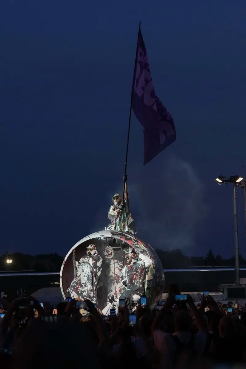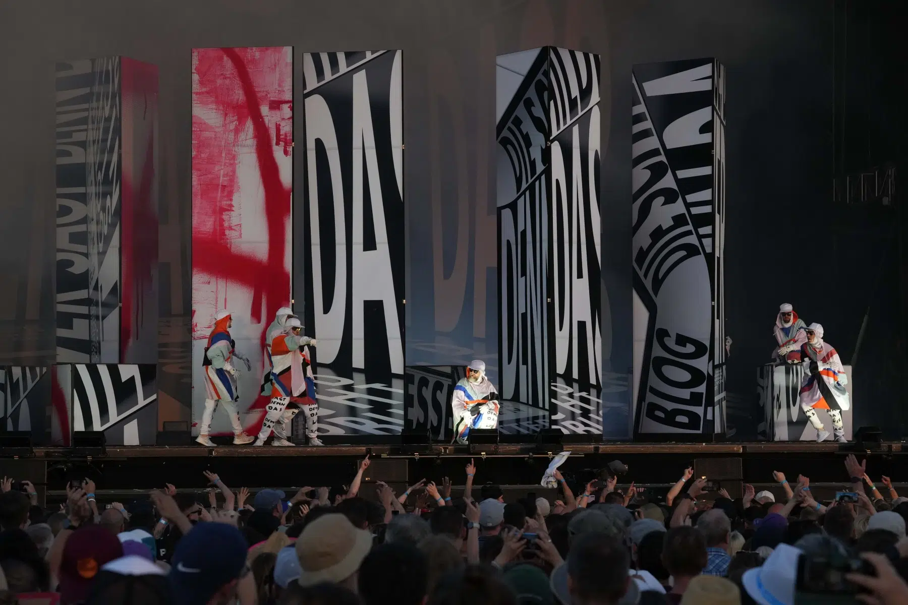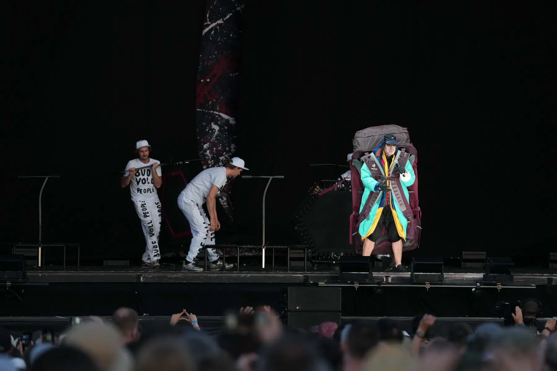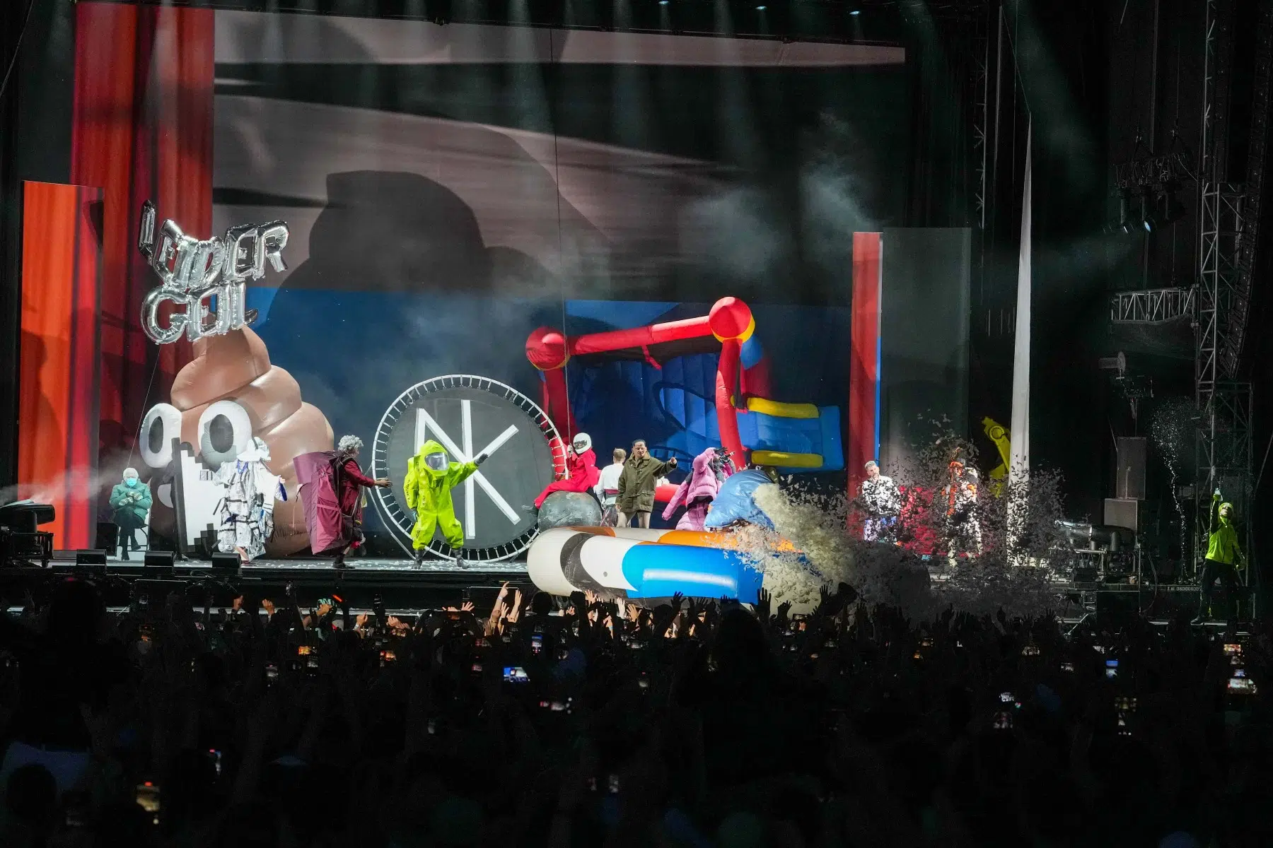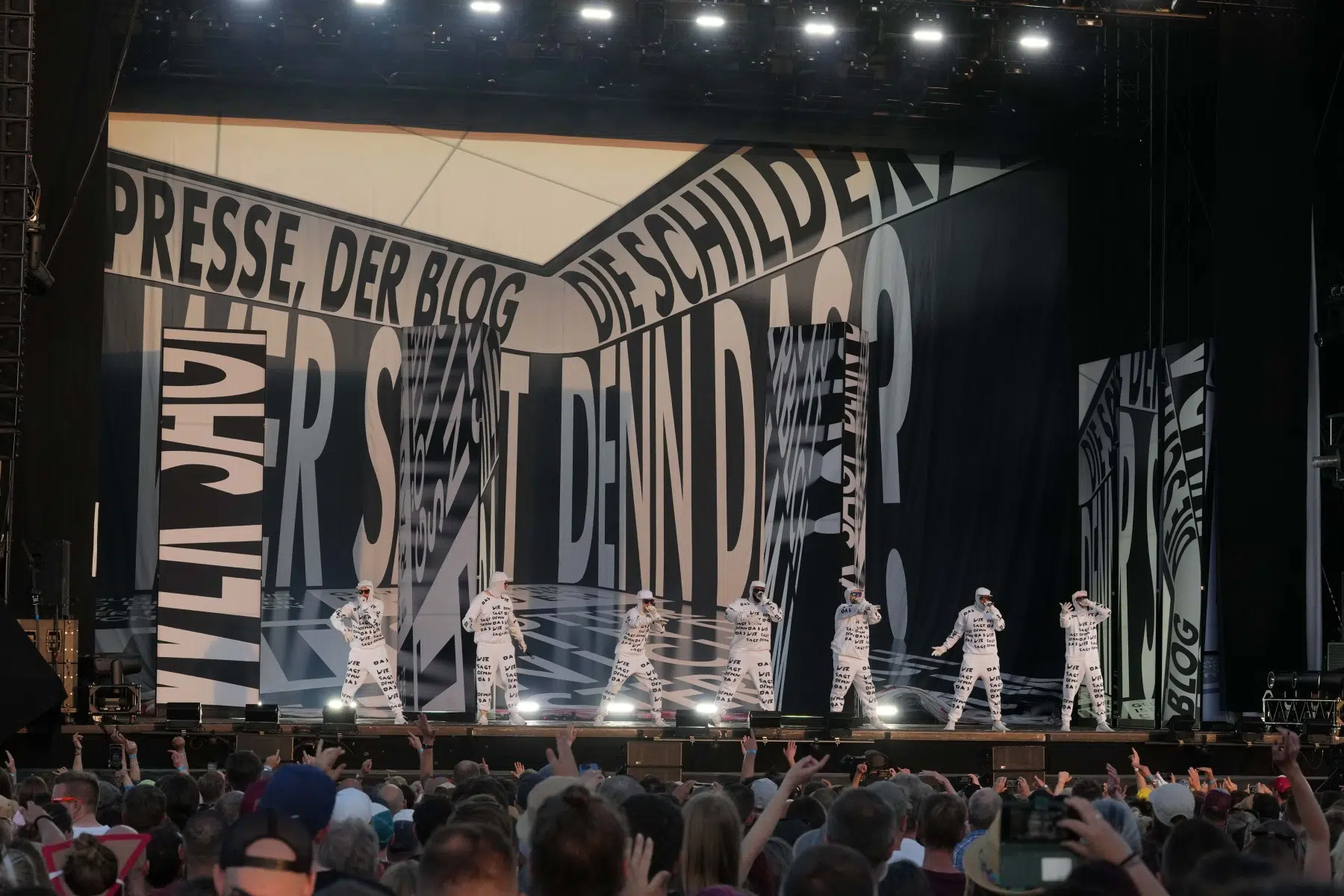 Schon bei den ersten Takten von „Denken Sie groß“ wurde klar: Das wird kein gewöhnlicher Konzertabend. Pyro, Licht, Konfetti, überdimensionale Kostüme und eine Bühnenshow, die eher an eine Mischung aus Theater, Protestmarsch und Clubnacht erinnert – DEICHKIND ziehen alle Register. Es ist ein kontrolliertes Chaos, das mit jeder Minute an Intensität gewinnt.
