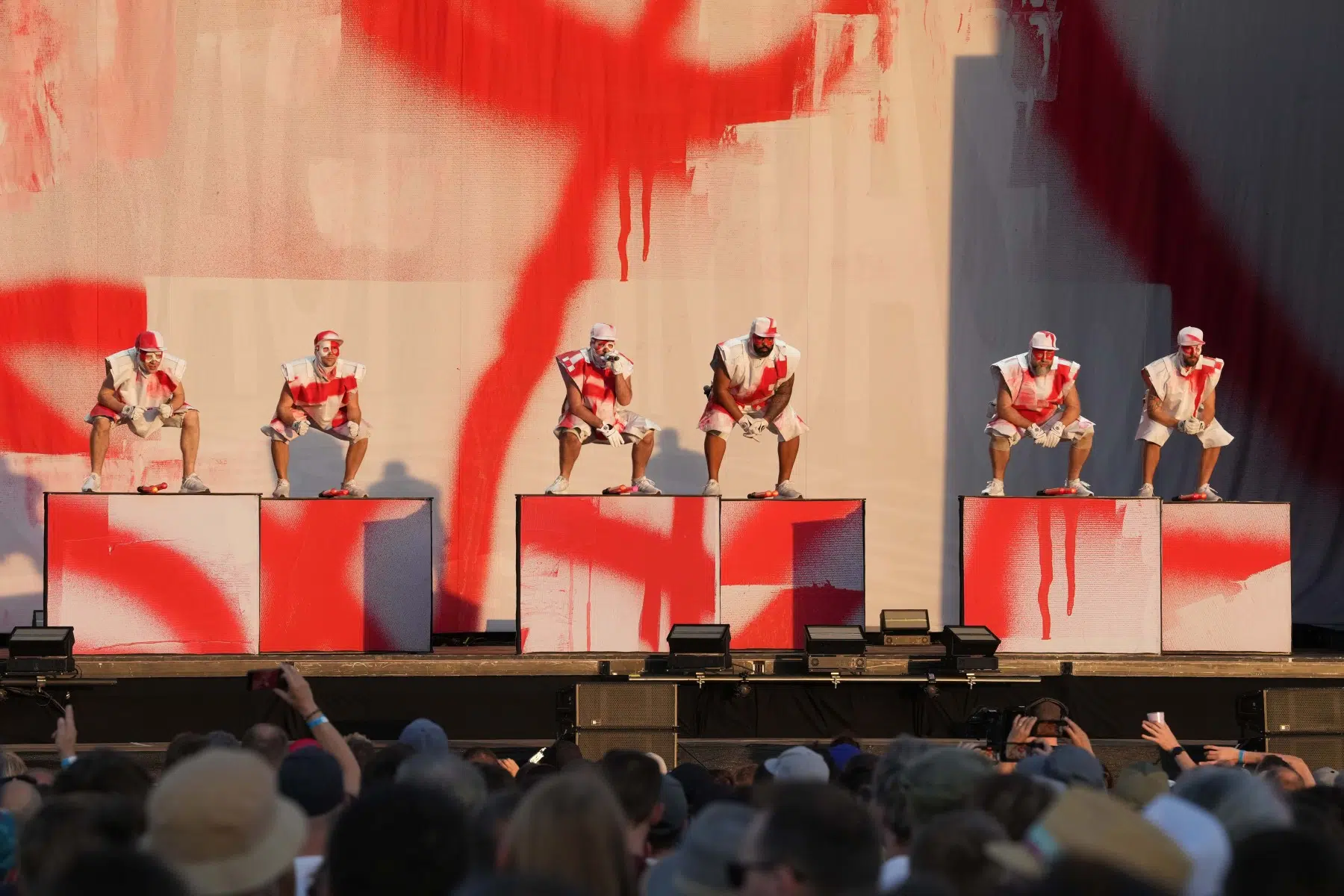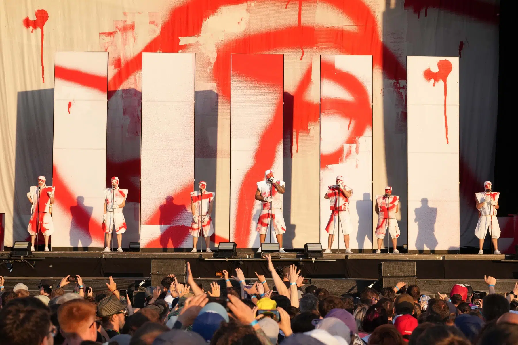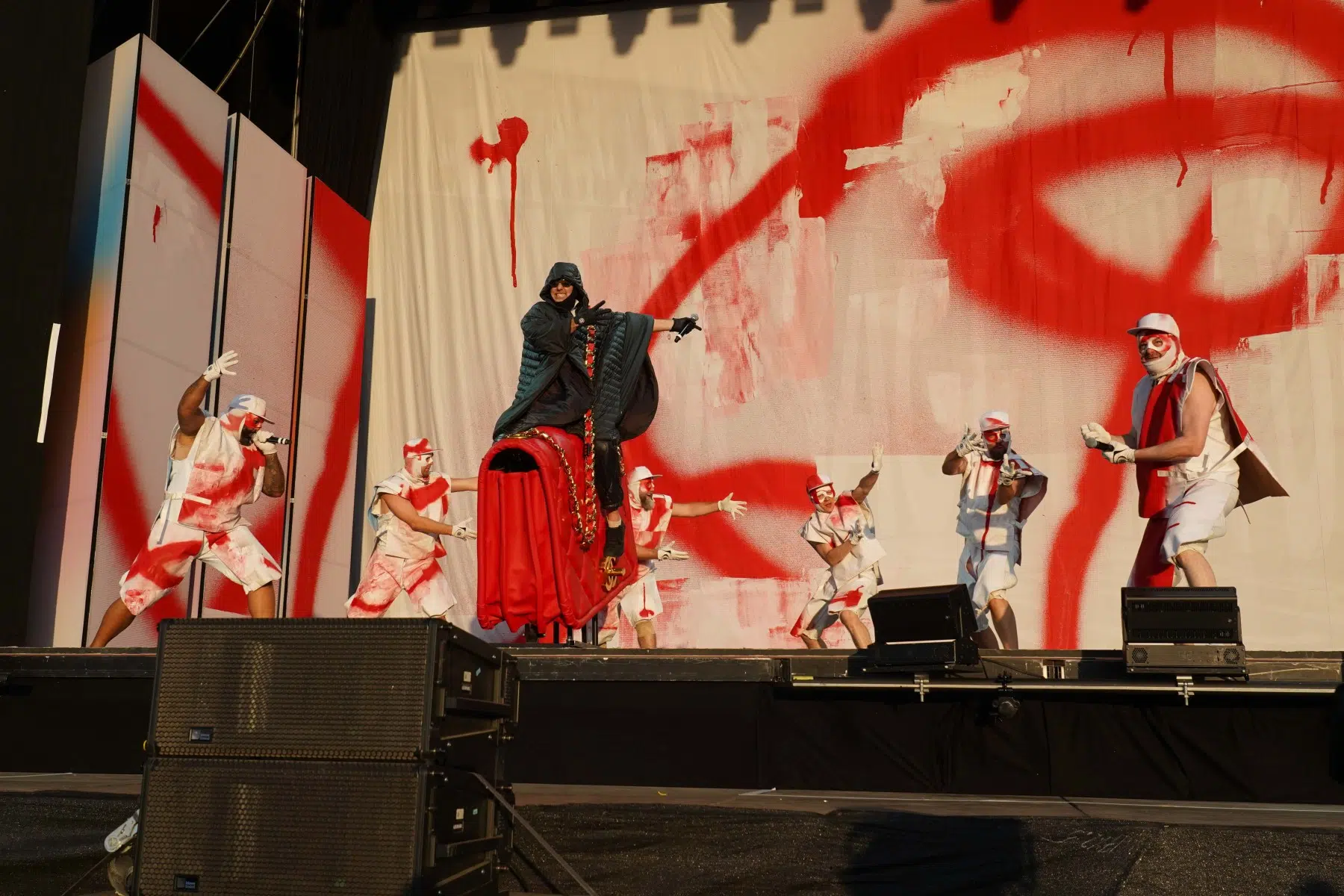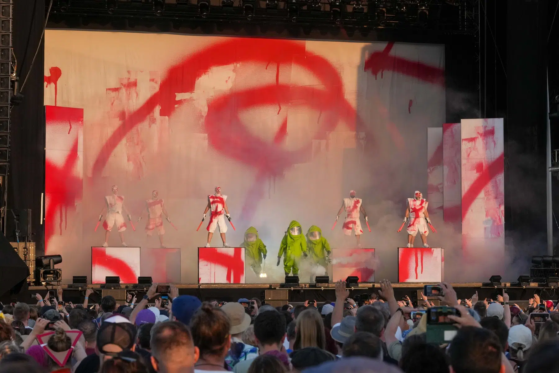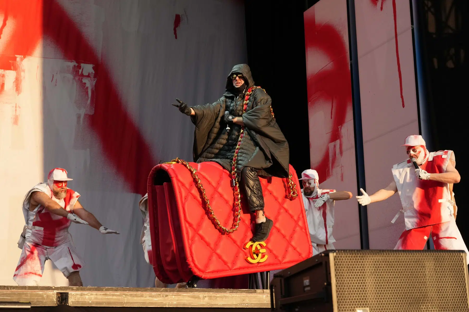 Schon bei den ersten Takten von „Denken Sie groß“ wurde klar: Das wird kein gewöhnlicher Konzertabend. Pyro, Licht, Konfetti, überdimensionale Kostüme und eine Bühnenshow, die eher an eine Mischung aus Theater, Protestmarsch und Clubnacht erinnert – DEICHKIND ziehen alle Register. Es ist ein kontrolliertes Chaos, das mit jeder Minute an Intensität gewinnt.