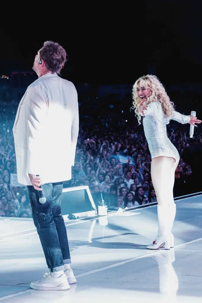 Carpenter began her set in a sparkling white one-piece with her name emblazoned in pink (naturally) across the chest, calf-high white boots, and with her hair in tight curls, as she launched into Busy Woman, Taste and Good Graces, while Slim Pickins had 65,000 fans singing at the top of their lungs. An illuminated ‘SC’ dazzled at the top centre of the stage.