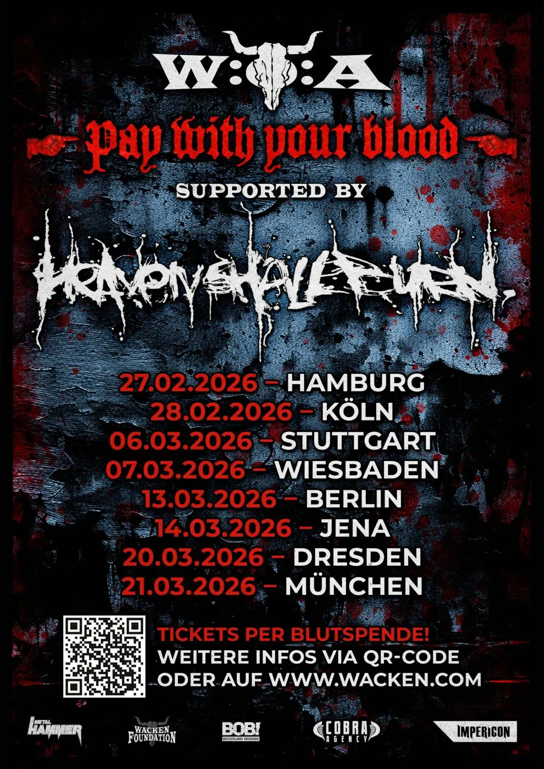 „Wir wissen, dass die Metalheads in unserer Community Verantwortung zeigen und helfen, wo sie helfen können. Wir wissen auch, dass sie am allerliebsten auf gute Metal-Konzerte gehen“,erklärt Thomas Jensen (Gründer und Veranstalter Wacken Open Air). „Wir wissen ebenso, dass Heaven Shall Burn sehr bewusst und solidarisch durch die Welt gehen. Die Aktion ‚Pay with your Blood‘ ergibt sich für die anstehenden Tour daraus doch fast von selbst, nicht wahr?“ Sein Partner Holger Hübner (Gründer und Veranstalter Wacken Open Air) fügt hinzu: „Das Thema Blutspende liegt uns schon lange am Herzen. Deshalb arbeiten wir seit Jahren mit Blutspendediensten zusammen und verfolgen vielfältige Aktionen während und abseits des Festivals. Wir sind froh, hier ein paar Fäden zusammenführen zu können und danken den Jungs von HSB ausdrücklich – diesmal nicht nur für die fetten Riffs, sondern auch für diese tolle Kooperation.“
