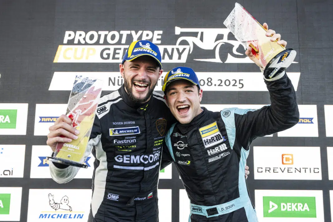 Nürburg. Am Ende vom zehnten Saisonrennen des Prototype Cup Germany jubelten einmal mehr Danny Soufi (22/USA) und Pavel Lefterov (27/BUL, beide Konrad Motorsport). Und der Jubel fiel dieses Mal sogar etwas lauter aus, denn die bulgarisch-amerikanische Paarung darf sich vorzeitig Meister im Prototype Cup Germany 2025 nennen. „Ich bin happy und auch erleichtert, dass wir es hier geschafft haben, nachdem wir durch den Sieg gestern schon so nah dran waren“, strahlte Soufi, der seit dem Premierenjahr des Prototype Cup Germany im Jahr 2022 in der deutschen LMP3-Serie am Start ist. Und auch Lefterov freute sich: „In meiner ersten Saison in der LMP3-Klasse gleich Meister zu werden ist natürlich besonders. Das Team hat uns immer ein tolles Auto zur Verfügung gestellt und Danny als Teamkollege war für mich perfekt. Er ist schnell und wir passen auch menschlich sehr gut zusammen.“ Platz zwei im Rennen auf dem Nürburgring ging an die besten Junioren Riccardo Leone Cirelli (17/ITA) / Mattias Bjerre Jakobsen (18/DEN) vor Mattis Pluschkell (21/Elmenhorst) / Maksymilian Angelard (18/POL, alle BWT Mücke Motorsport). In der Trophy revanchierte Thomas Ambiel (45/Eppingen, Rinaldi Racing) sich für seine gestrige Niederlage gegen Michael Herich (48/Brühl, Gebhardt Intralogistics Motorsport) und gewann vor dem Gebhardt-Piloten. Damit ist dem Rinaldi-Schützling der Titel in der Trophy-Wertung nicht mehr zu nehmen.