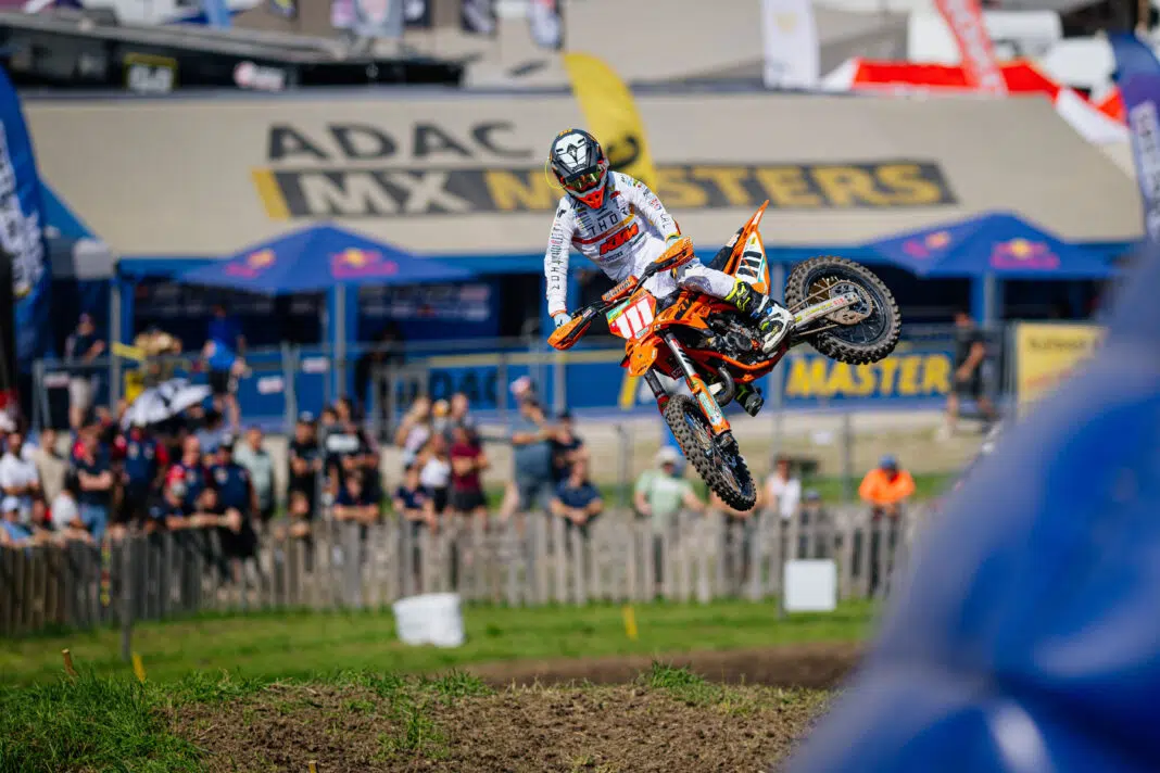 Maxime Grau machten bei seinem Comeback die heißen Temperaturen nichts aus. Der Franzose übernahm im ersten Lauf am Samstag mit dem Red Bull Holeshot die Kontrolle. Er führte das ganze Rennen lang und fuhr einen ungefährdeten Sieg vor Lyonel Reichl (LIE/KTM Sarholz Racing Team) und Valentin Kees (D/Kosak Racing Team) ein. Am Sonntag im zweiten Lauf gab es ein ähnliches Bild: noch in der Startrunde ging Grau an die Spitze und gewann abermals vor Reichl und Kees. Auch im dritten Rennen führte kein Weg an Grau vorbei. Doch dieses Mal gewann er vor Mads Fredsoe (DK/Cat Moto Bauerschmidt Husqvarna) und Liam Owens (AUS/Cat Moto Bauerschmidt Husqvarna). In der Veranstaltungswertung gewann Grau vor Reichl und Fredsoe. Kees verpasste bei Punktgleichstand das Podium um einen Platz. Bradley Mesters (NL/Kosak Racing Team) rundete die Top-Fünf ab und behielt aber knapp die Führung in der Meisterschaft vor Fredsoe, Nicolai Skovbjerg (DK/Wozniak MX Racing Team), Grau und Quentin Prugnieres (F/WZ-Racing KTM).