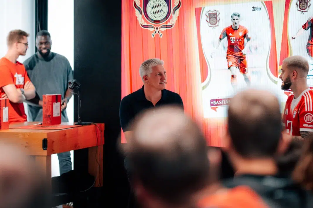 Topps: Hallo zusammen! Cool, dass so viele von euch so zahlreich erschienen sind zu unserem Launch Event für das neue 125 Jahre FC Bayern Set. Wie die meisten von euch wahrscheinlich wissen, haben wir auch noch einen ganz besonderen Gast mit dabei, der wird gleich die Chance haben, die Box das allererste Mal zu öffnen. Vorher nutzen wir das natürlich aber auch, um noch ein paar Fragen zu stellen. Wir begrüßen ihn, hier ist: Bastian Schweinsteiger.