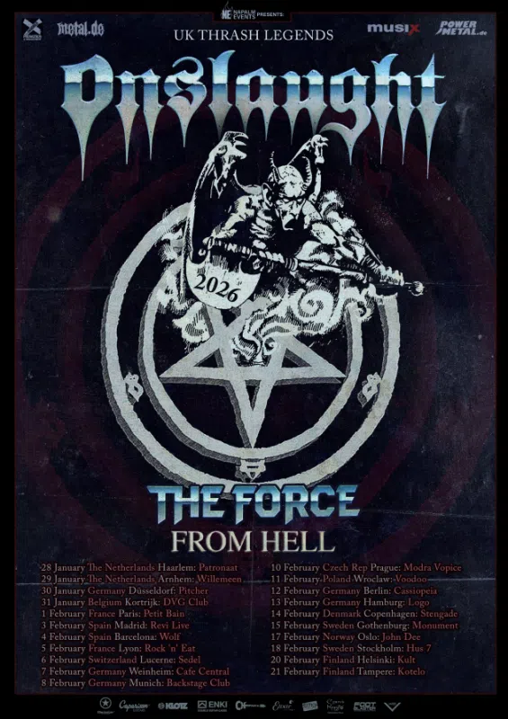 Den Riesenerfolg ihrer noch laufenden „Power From Hell“-Tour sowie ihres karriereprägenden Doppelalbums „Origins Of Aggression“ (23. Mai 2025 via Reigning Phoenix Music) fortsetzend, wird die Truppe im Rahmen ihrer kommenden „The Force From Hell“-Reise erneut sämtliche Pits ins Chaos stürzen. Anfang 2026 werden ONSLAUGHT einmal mehr 22 Städten auf dem ganzen Kontinent die ultimative Thrash-Vollbedienung liefern, die auf Tracks ihres kultigen Debüts „Power From Hell“ sowie aus Stücken ihres Albums „The Force“, dessen 40-jähriges Jubiläum kommendes Jahr ansteht, basieren wird.