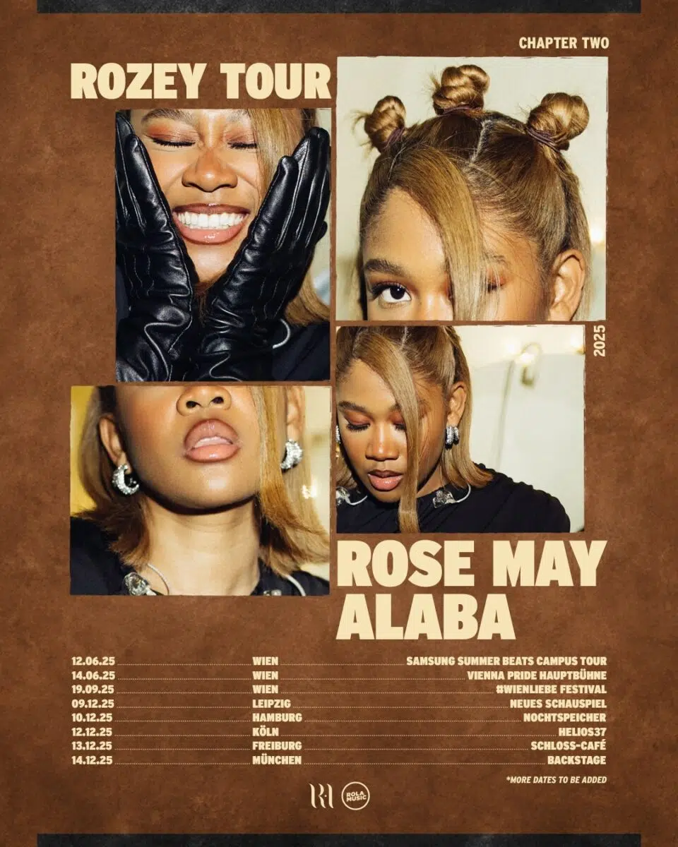 Die österreichische Queen of Afro-Pop-Vibes ist zurück auf der Bühne! Nach ihrer gefeierten Debüt-EP „ROZEY!“ meldet sich Rose May Alaba mit frischen Live-Shows in Wien, Leipzig, Hamburg, Köln, Freiburg und München zurück.