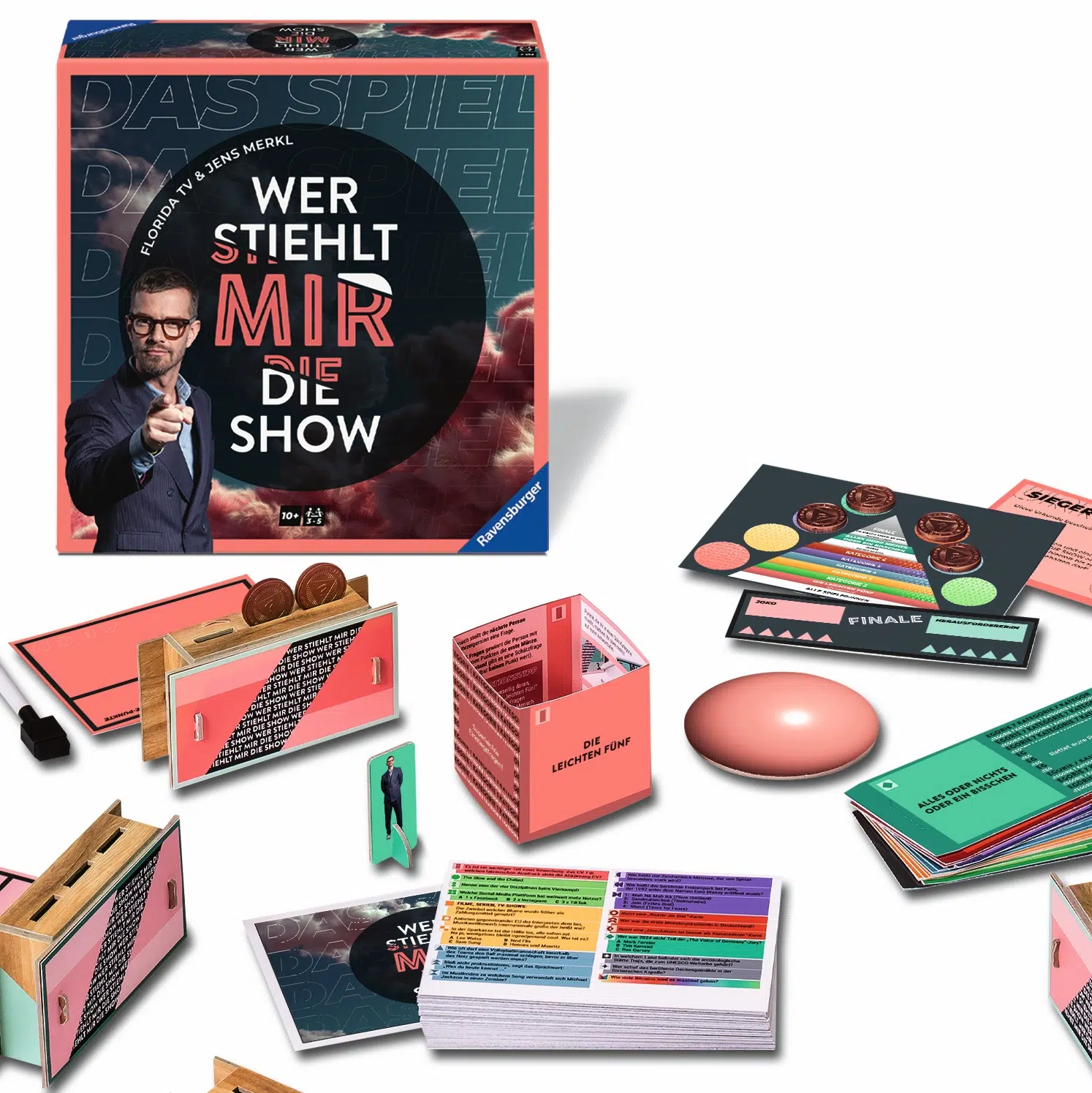 Quiz, aber anders. Show, aber zuhause. „Wer stiehlt mir die Show?“ ist kein klassisches Quiz. Es geht um Wissen, Showtalent und Timing. Wer moderiert, wer kämpft, wer blufft? Jeder am Tisch wird mal zum Star, zum Entertainer oder zum knallharten Herausforderer. Das Spiel entstand in enger Kooperation mit Florida TV und ProSiebenSat.1 sowie dem renommierten Spieleautor Jens Merkl.