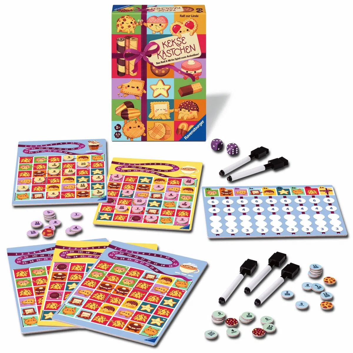 Für noch mehr Abwechslung sorgen die doppelseitigen Spielpläne – eine für den Einstieg und eine für echte Keksperten. Das Ganze kommt in einer kompakten Box mit abwischbaren Stiften – ideal für unterwegs, für zwischendurch oder die nächste Snack-Pause – egal ob auf dem Schulhof oder woanders.