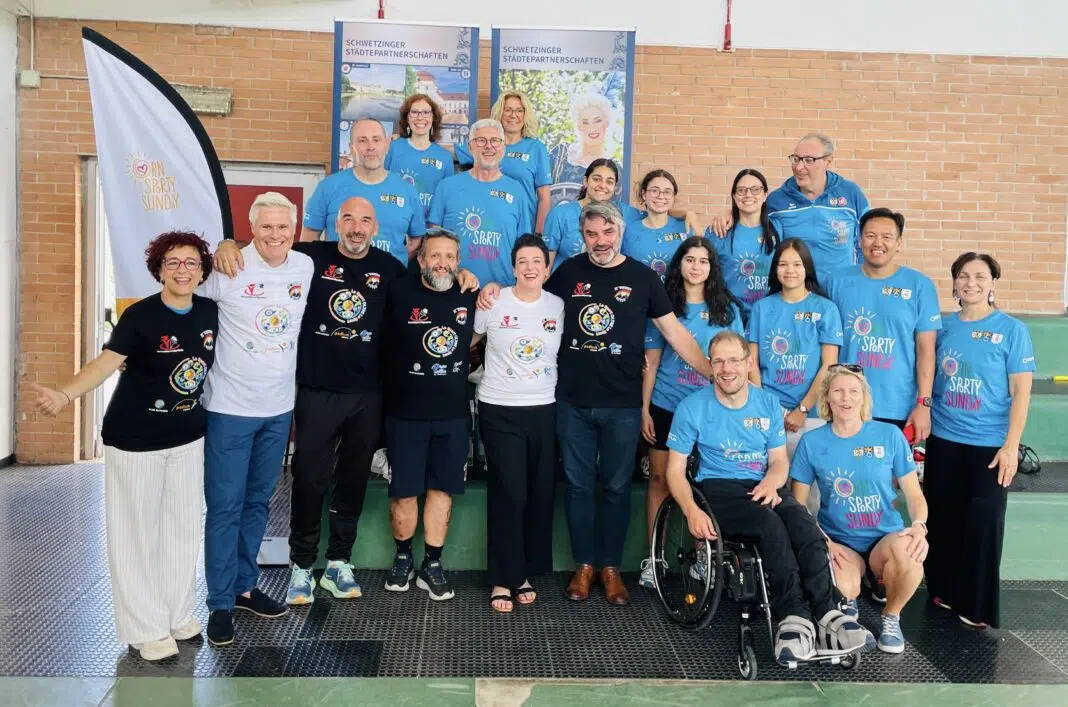 Grund für den Besuch in Spoleto war ein gemeinsames inklusives Sportprojekt der Stadt Schwetzingen und des TV 1864, die zusammen mit ihrer italienischen Partnerstadt und dortigen Sportvereinen einen Open Sporty Sunday „Speciale“ veranstalteten – als Jubiläumsgeschenk im Rahmen des 20. Jahres der deutsch-italienischen Städtepartnerschaft. Anlässlich des „SportCity Day“ 2025, bei dem sich landesweit mehr als 150 Städten beteiligten, ergänzte der Open Sporty Sunday „Speciale“ das vielfältige Sportangebot vor Ort. Das gesamte Projekt wurde finanziell von den Städten Schwetzingen und Spoleto wie auch vom TV 1864 getragen. Vor Ort vertreten war auch der Förderverein Städtepartnerschaften Schwetzingen e.V. – durch Vorstandsmitglied Rose Aboayash, die als Teamerin und Coach auch beim Open Sporty Sunday aktiv mitwirkte
