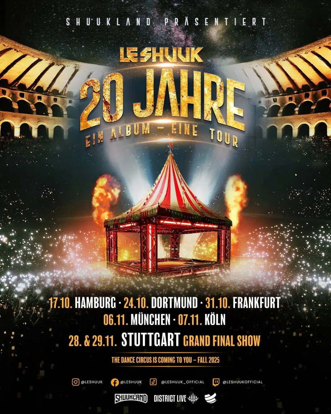 Zur Feier seines 20-jährigen Jubiläums bringt die „20 JAHRE LE SHUUK TOUR“ seine Album-Release-Party im Jahr 2025 in ausgewählte Locations in ganz Deutschland. Es ist erste Konzerttour von Le Shuuk überhaupt. Im Mittelpunkt steht die enge Verbindung zu seinen Fans, die seine mitreißenden Sets jedes Mal eskalieren lassen. Hierfür gibt es auf der Tour eine spezielle Stage mit 360-Grad-Cage, damit die Fans ihn hautnah erleben können.