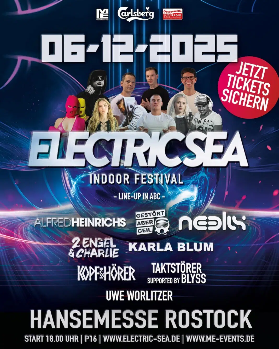 Am 6. Dezember 2025 verwandelt sich die HanseMesse Rostock erneut in einen Tempel elektronischer Musik: Das Electric Sea Dance Festival präsentiert sein offizielles Line-Up und verspricht ein Winterfestival voller magischer Momente, pulsierender Beats und spektakulärer Show-Elemente.