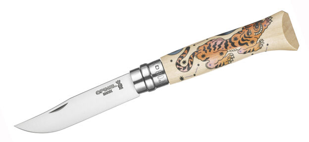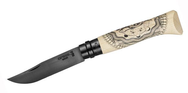 Alle Messer der „Cosmos“-Kollektion sind mit einem Griff aus Buchenholz versehen, dessen Design im Sublimationsverfahren aufgebracht wird. Die 8,5 cm lange Edelstahlklinge sorgt für die bewährte OPINEL-Qualität. Das Modell von Benjamin Jeanjean ist zusätzlich mit schwarzer PVD-Beschichtung versehen.