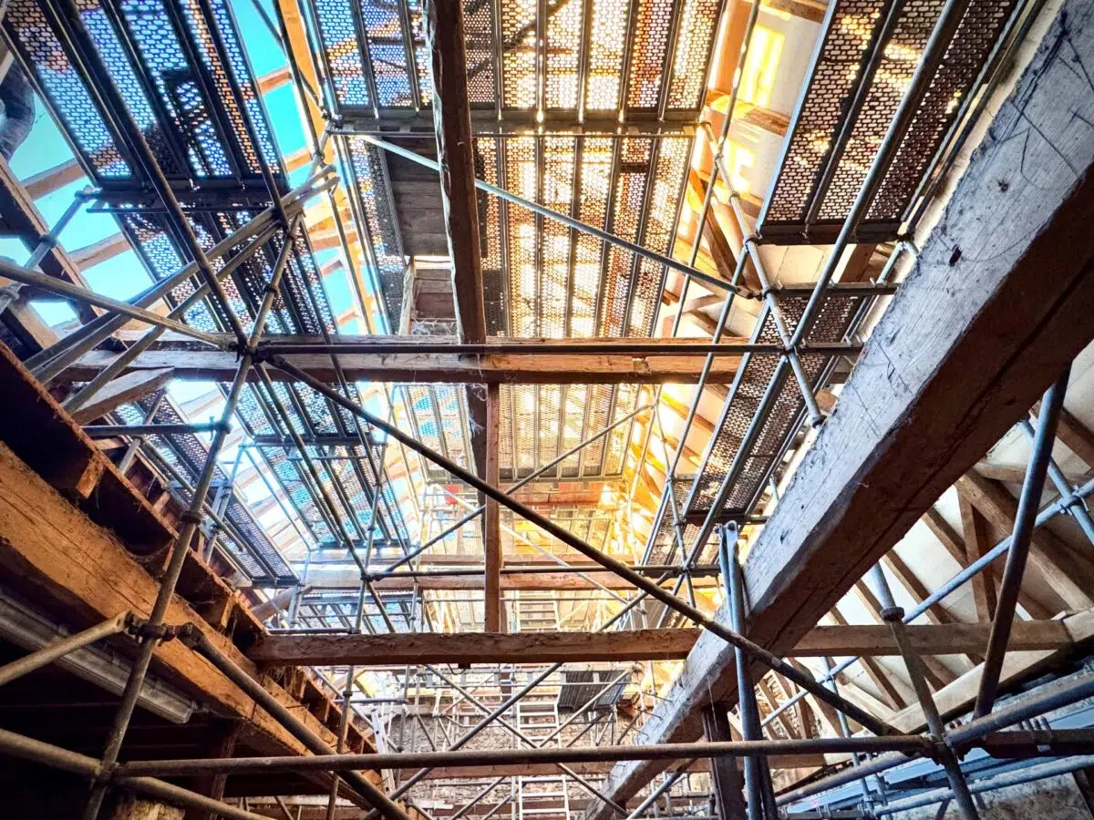 Wer aktuell in den Innenhof der Schlossgasse 12–16 blickt, stellt schnell fest: Hier passiert richtig viel. Zwischen Gerüsten, Baucontainern voller zerbrochener, ausgedienter Ziegel und offenen Dachflächen arbeiten die Teams das Gebäudeensemble Stück für Stück durch. Die frühere Vinothek des Stadtweinguts steht leer; ein paar aufgestellte Weinfässer erinnern noch an den alten Betrieb, der derzeit ausschließlich in der Vinothek am Fischmarkt stattfindet. Im Nebengebäude ist das Dach offen. Zimmerer und Dachdecker setzen die maroden Bereiche instand, in denen die Feuchtigkeit den dicken Holzbalken mit den Jahren zugesetzt hat, und schließen neue Ziegelreihen. Insgesamt werden bei der umfassenden Sanierung rund 1.000 Quadratmeter Dachfläche erneuert. Dabei kamen einige unangenehme Überraschungen ans Licht. An den Stellen, an denen die Dächer der einzelnen Gebäude aneinanderstoßen, waren Balken feucht und stark geschädigt, ebenso Teile des Zwischenbodens im Dachgeschoss. „Zum Glück haben wir gute Handwerker aus der Region, die für jede schwierige Stelle eine Lösung finden“, sagt Architekt Martin Klenner.