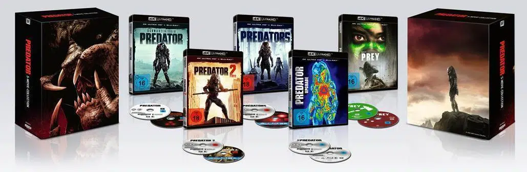 PREDATOR 5-MOVIE-COLLECTION erscheint am 28. November 2025 als DVD-, Blu-ray- und als 4K UHD-Box. Das umfangreiche Bonusmaterial enthält unter anderem Featurettes, entfallene Szenen, Making Ofs und Audiokommentare. Vorbestellungen sind bereits möglich.