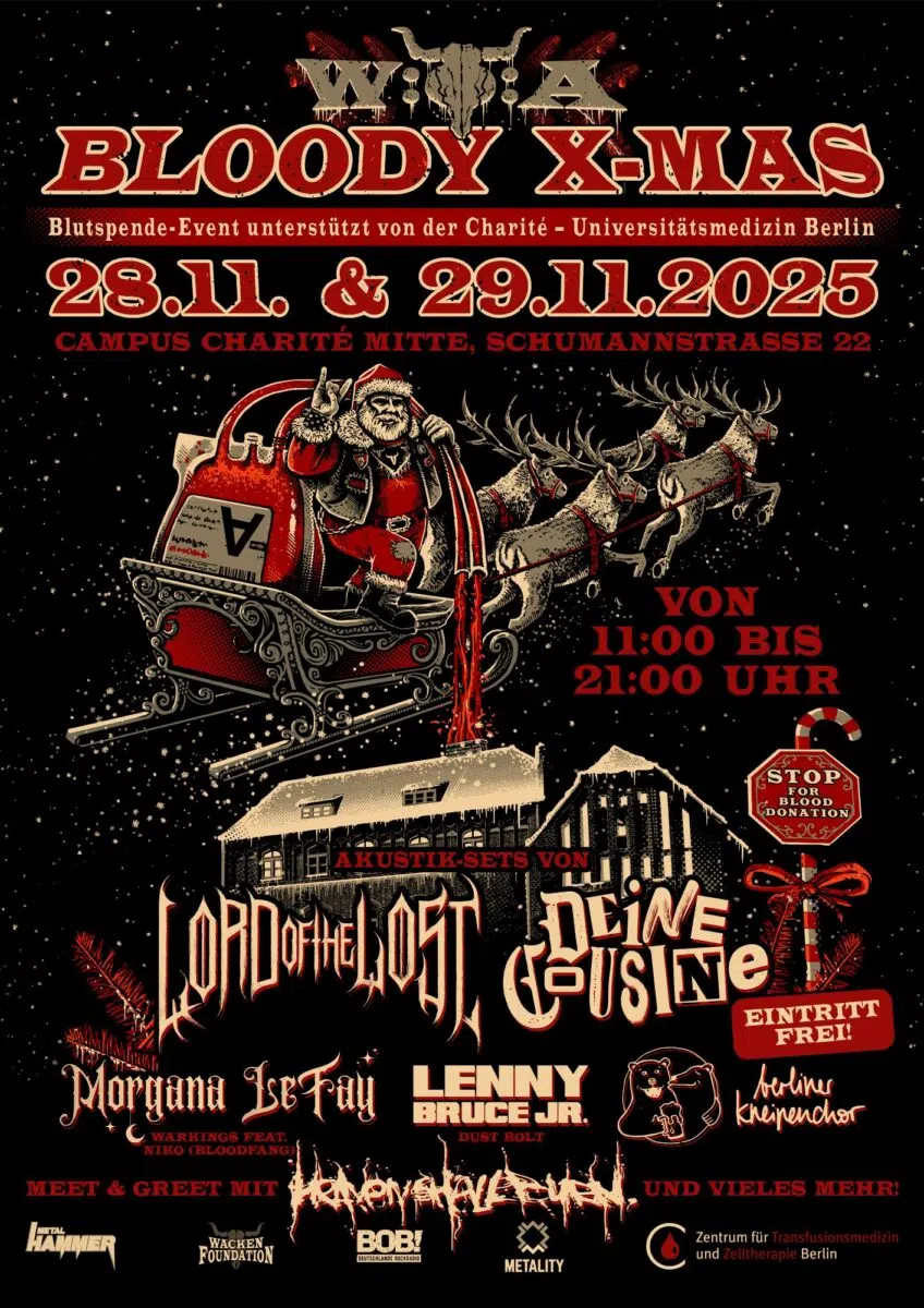 Horcht herbei, liebe Metal-Gemeinde! Pünktlich zum Beginn der vorweihnachtlichen Zeit startet am 28. November der zweitägige Bloody X-Mas Markt 2025 auf dem Campus der Charité Mitte. Bereits zum zweiten Mal verwandeln das Wacken Open Air und die ZTB Blutspende der Charité – Universitätsmedizin Berlin das Gelände in einen Ort der lautstarken Besinnlichkeit, an dem Musik, Gemeinschaft und gesellschaftliches Engagement eine einmalige Einheit bilden.