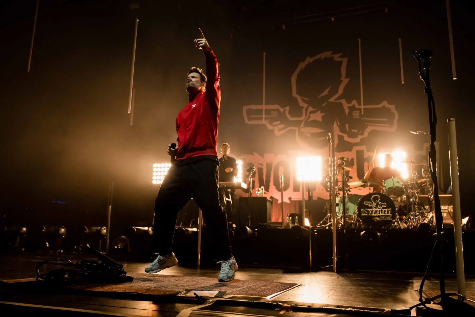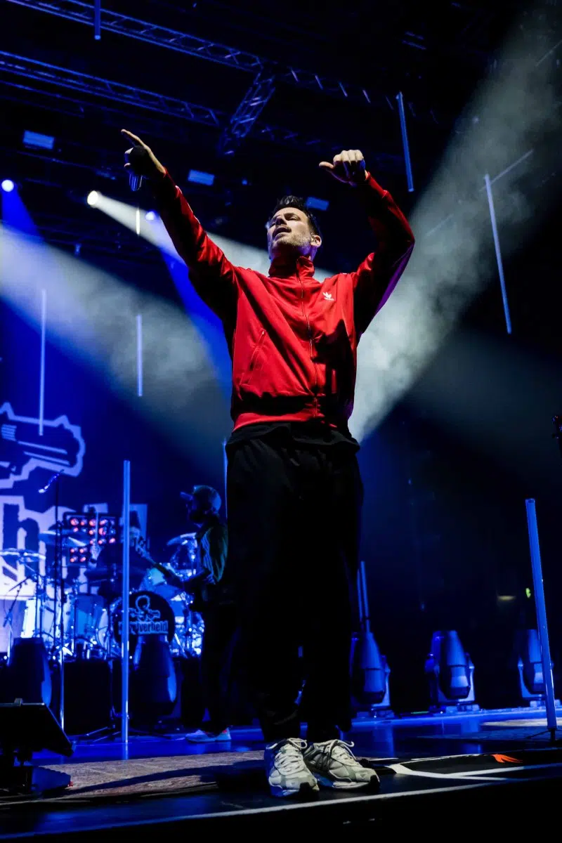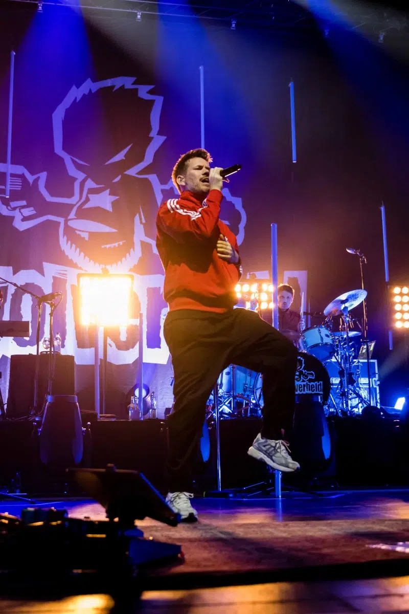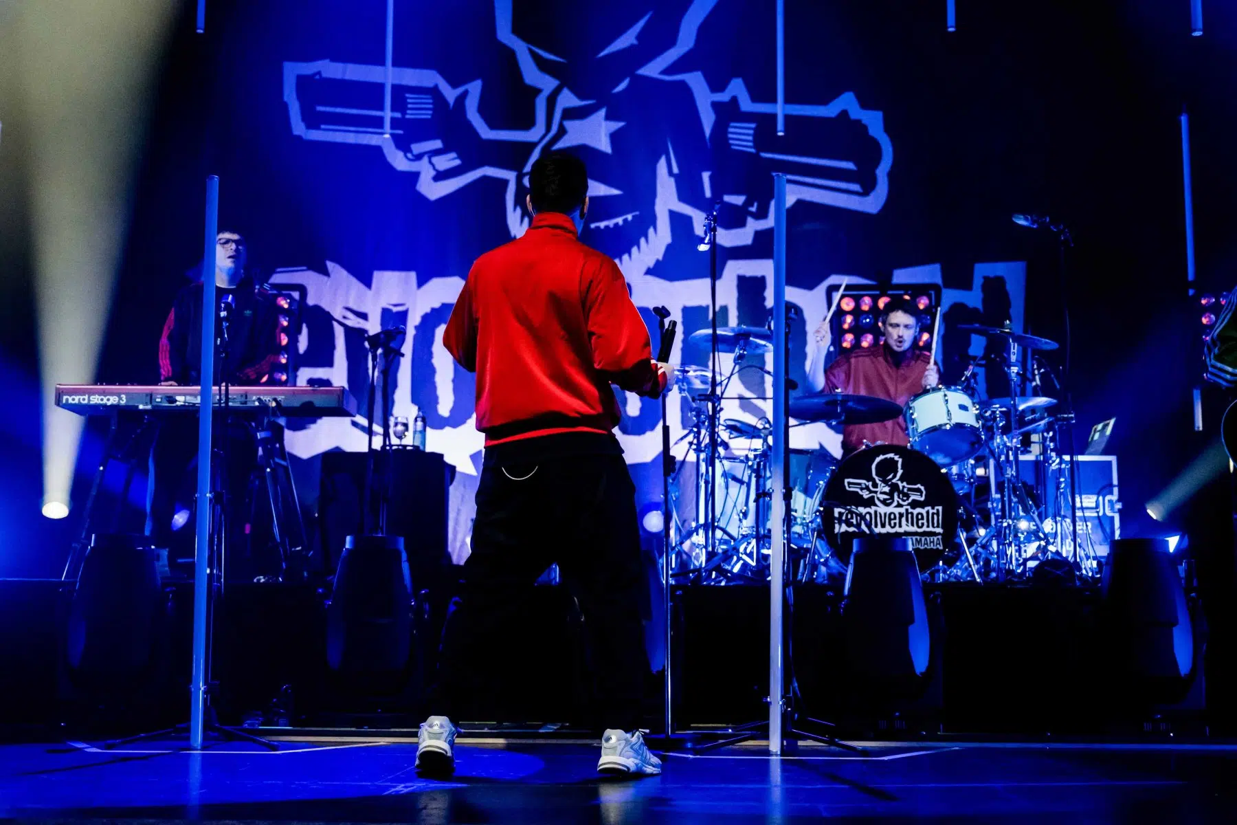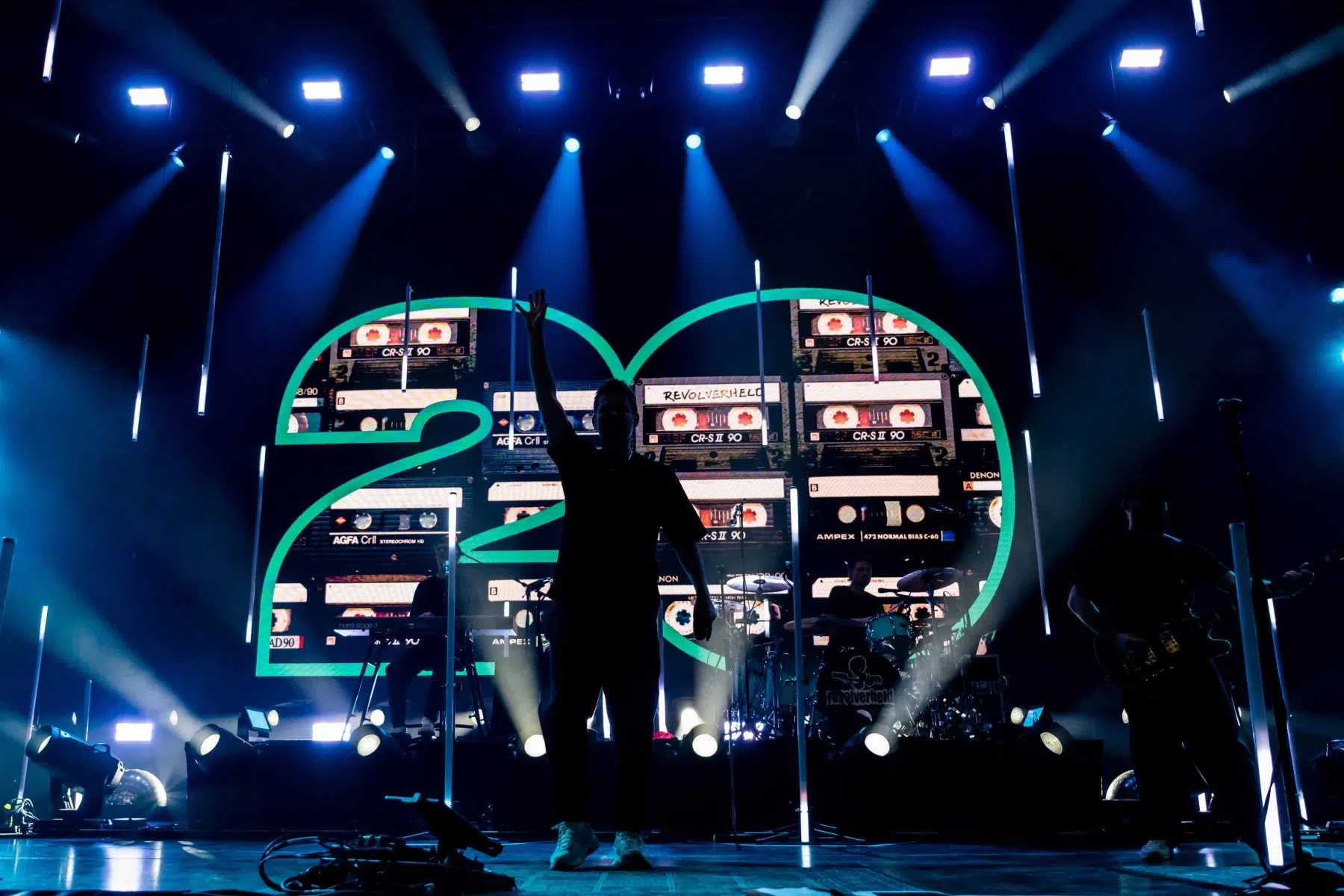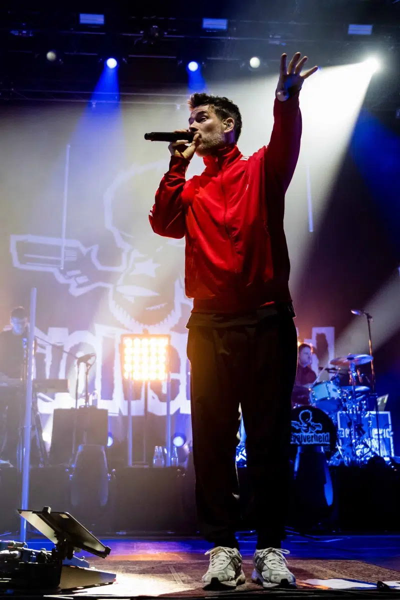 Nachdem Sie die Bühne verlassen, wird es im Saal dunkel und ein schwarzer Vorhang und verschiedene Lichtelemente versetzen die gesamte Halle in Vorfreude auf Revolverheld. Ein Einspieler über 20 Jahre Bandgeschichte startet, der Vorhang fällt und Revolverheld reißen alle mit „Generation Rock“ sofort mit. Es ist spürbar, dass alle Anwesenden viele persönliche Erinnerungen mit den Songtexten verbinden und die Halle verwandelt sich in ein riesengroßes Wohnzimmer. Frontmann Johannes Strate lässt den Funken mit seiner hanseatischen Lässigkeit sofort überspringen und begleitet durch das gesamte Konzert mit schönen Erinnerungen oder lustigen Anekdoten. In seiner Plauderlaune scherzt er: „Okay, wir spielen noch einen Song, obwohl ihr heute eine Standup-Comedy-Show gebucht habt“. Zum Running Gag des Abends wird die Frage nach einer Aftershow-Party so wie früher. Als Ergebnis kommt raus, vielleicht sollten sie zukünftig ihr Konzert um 18 Uhr starten, dann könnte es klappen.