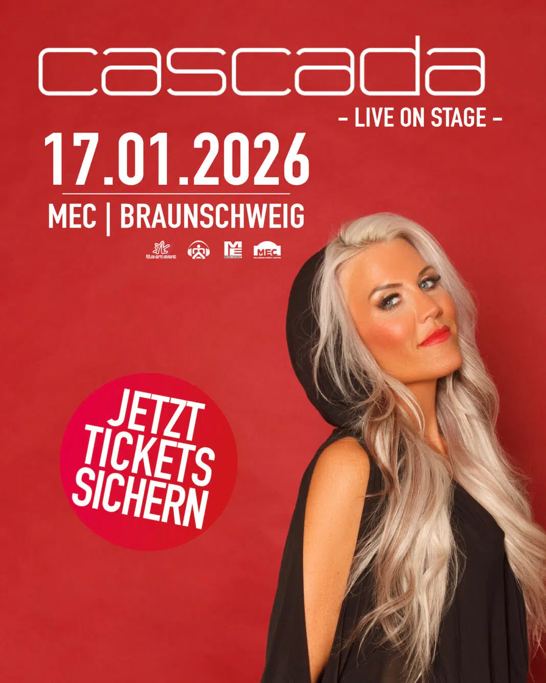 Am 17. Januar 2026 ist es soweit: Cascada bringt ihre Dance-Hymnen ins MEC Braunschweig – eine Nacht, die niemand verpassen sollte! Tickets sind ab sofort im Vorverkauf ab 29,99 € inkl. Gebühren erhältlich unter: https://www.me-events.de/events/