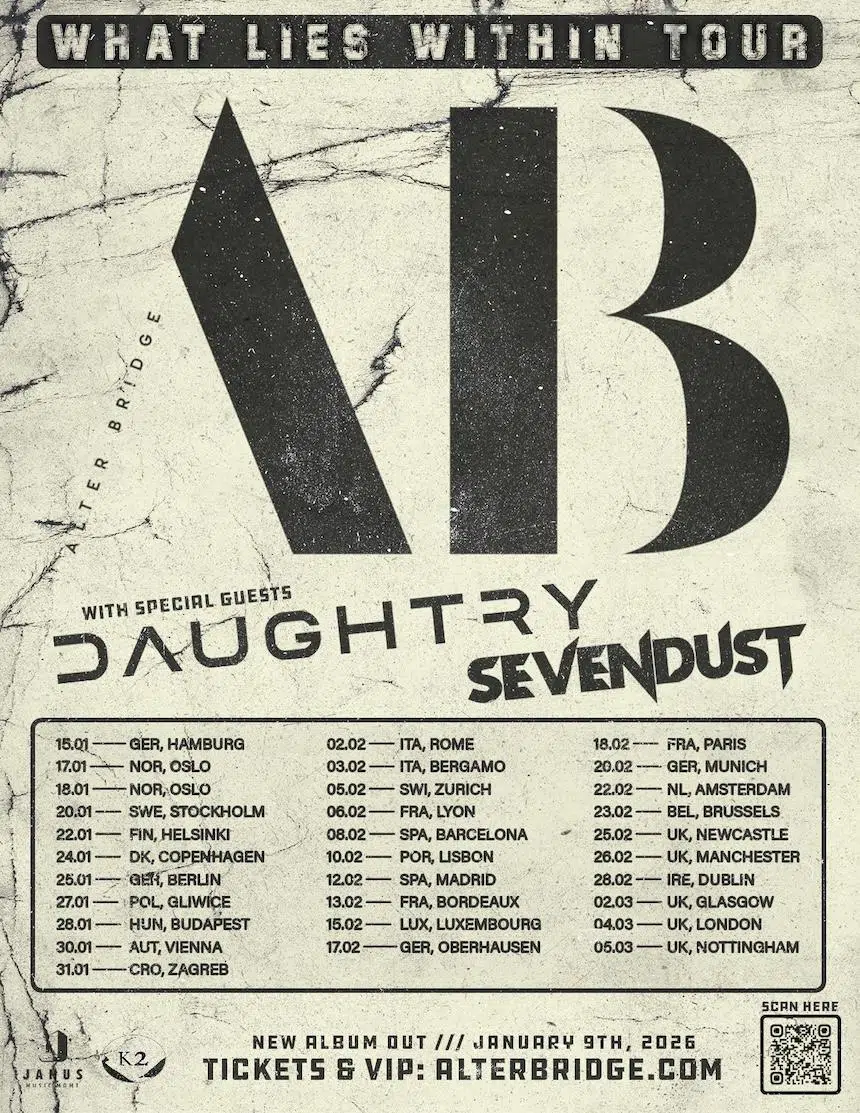 Pünktlich zum Release begeben sich ALTER BRIDGE auf große „What Lies Within Tour“. Die 31 Shows umfassende Europatour beginnt am 15. Januar 2026 in Deutschland und endet am 5. März in Nottingham (UK) – mit dabei: Daughtry und Sevendust! Alle Infos und VIP-Packages: www.alterbridge.com.